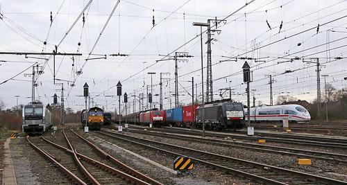 Station Emmerich is vlak en troosteloos met opstelsporen voor een x-aantal goederentreinen, die braaf wachten tot ze verder mogen doorrijden