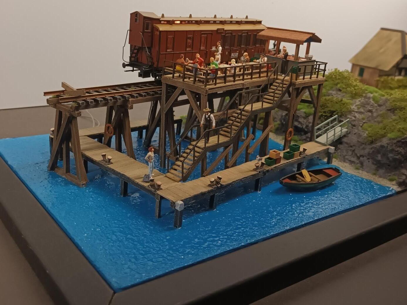 een meertje, met hotel en andere huisjes en met een weg omhoog via een meersporige overweg aangesloten op de stad. Er is afgelopen jaar ervaring opgedaan met het maken van een overweg in M-rails, dus dat durven we wel aan (zie nr 1 op foto).