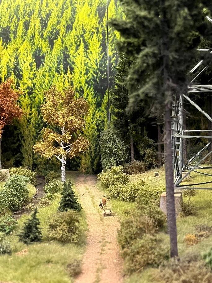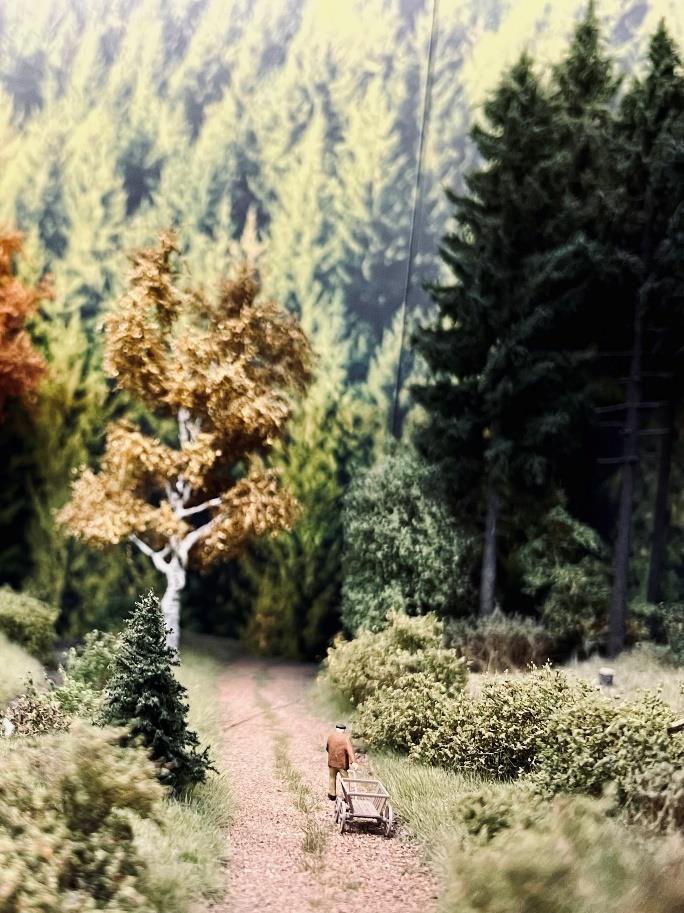 Robert: In 2023 waren we bij On traXS in het Spoorwegmuseum en zag ik deze scene die de sfeer perfect in beeld brengt. Oude man gaat het bos in om hout te sprokkelen. Een sfeer die ik op mijn baan graag wil weergeven. In Rijswijk 2025 zag ik de baan opnieuw, maar nu was opa in gezelschap van een kleinkind. Overigens afkomstig van de “Greifenbachtalbrücke” van de Bimmlbahner (Facebook).