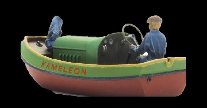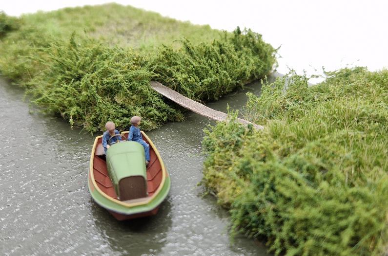 De koppige koe en knecht Gerben Zonderland van boer Jellema worden met een paar drupjes secondelijm in het weiland vastgezet. Het is niet verstandig de poten van de koe en de laarzen van Gerben rechtstreeks uit het flesje van lijm te voorzien. Voor je het weet hangt er een dikke klodder aan. Deponeer een druppel secondelijm op een restje hout of plastic. Tip vervolgens elke poot van de koe er even in en plaats het beest dan in de wei. Voor knecht Gerben geldt natuurlijk hetzelfde. Artitec heeft in de verpakking ook nog een stuk ‘touw’ verstopt. Dat werd nog wel een uitdaging om die met houtlijm aan hand en nek vast te zetten. Sommige deelnemers stuurden Gerben en zijn koe in de richting van de loopplank over de sloot. Dat kan bijna niet goed gaan! Volgens schrijver Hotze de Roos is de Kameleon een lompe, ijzeren boot met een stompe steven en in het midden een motor die schuilging onder een ijzeren kap. De motor kwam uit de afgedankte auto van de huisarts. Achter die kap waren het autostuur en de versnellingshandels aangebracht. Aan de vele kleuren van de regenboog op de romp heeft de Kameleon zijn naam te danken. Wij hebben een heel fijn schroevendraaiertje nodig om het model uit de verpakking los te krijgen. De letters Kameleon staan prachtig op de romp geschilderd. In de films over de Kameleon zie je de tweeling in hun schuit staan, maar in de boeken worden ze meestentijds zittend afgebeeld en zo heeftArtitec ze ook vormgegeven. Sietse natuurlijk achter het stuur en kies zelf maar: Hielke er naast of op de plecht van de boot. Met de nodige observaties vinden we allemaal een fraaie positie voor de Kameleon. Tijd om met het fan-penseel boeg- en hekgolf rond de boot te creëren. Een deelnemer koopt nog snel in de winkel een paar zwanen van Geke van Petegem Scenery. En iedereen maakt gebruik van de lichtbak om een fraaie foto van zijn of haar creatie te maken. Dat bewijst wel dat we zeer tevreden zijn met het resultaat van onze inspanningen. Bij het weggaan hoor ik een enkele modelbouwer zachtjes ‘Rataka tjieng ka boem, rataka tjieng ka boem’ zingen. Je herkent het natuurlijk als het liedje dat Tjalling, die andere boerenknecht, eindeloos zong. Maar er was ook iemand die Gerben citeerde: “Het is een ruuzelduuzeldaazel!”
