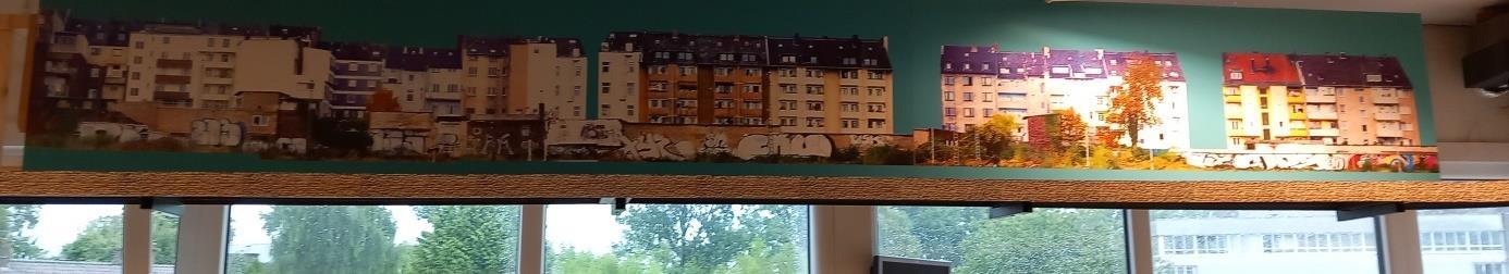 Eerst hadden we na het printen de totale achtergrond op Airtex (PVC-basis) deze print op platen willen plakken. Maar dan kreeg je het kleurverschil van de geschilderde blauwe muur ten opzichte van de kleur blauw van de print, dus niet doen. En de contouren van de gebouwen
