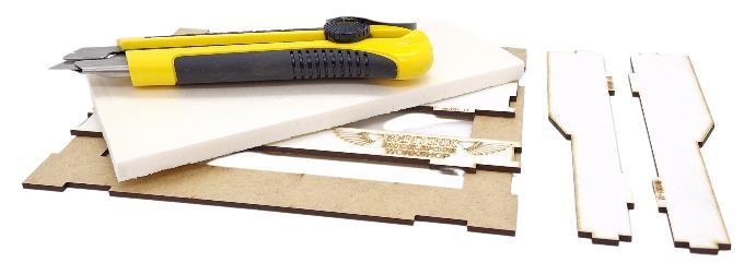 Ons diorama meet straks 15 x 21 centimeter. Daarvoor liggen op ieders werkplek vijf stukjes gelaserd MDF klaar, waarmee een A5-bakje gemaakt kan worden. Verder op ons knutselbureautje een Werkhaus-pennenbak met de nodige gereedschappen, maar ook een snijmat, lijm, water, een rol keukenpapier, lekkere snoepjes en - voor het geval dat - een EHBO-trommel. En ja, natuurlijk liggen er de twee Artitec-doosjes met de beloofde hoofdrolspelers. Maar die mogen voorlopig toekijken… Het A5 bakje heeft een bescheiden opdruk met naam en logo van Bentink, maar onze workshopleider Marcel van der Bent suggereert dat de onderdelen ook in spiegelbeeld en dus neutraal te gebruiken zijn. We krijgen per persoon een klodder MIFOTACK! uit het gamma van Minima Forma. Die lijm heeft wat droogtijd, maar met kleine stukjes maskingtape fixeren we het geheel tijdelijk in positie. In het bakje past precies een laag XPS van 2 cm dik. XPS kun je kennen als dakisolatie en heeft een vastere structuur dan piepschuim uit de verpakkingswereld. Het kruimelt nauwelijks en de boel komt niet onder de statische troep te zitten. Overigens hoef je niet naar de bouwmarkt om een heel pak XPS te kopen. Bentink verkoopt het per plaat. Een tweede laagje van slechts 1 cm dik is voor de weilanden. Met het 25 mm Stanley breekmes helemaal uitgeschoven snijden we, het mes vrijwel vlak houdend, deze plak XPS in tweeën, schuiven de stukjes tijdelijk links en rechts achter in ons diorama en tekenen de contouren van de hoogte af. Ook de oever van