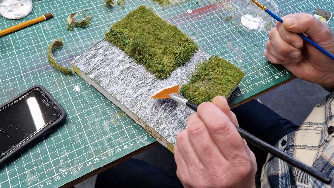 Ons plexiplaatje - oppervlakkig al droog direct na het airbrushen - is nu gereed om op zijn plek aan te brengen. Minimale drupjes MIFOTACK! aan de randen zijn voldoende en na droging totaal onzichtbaar. Laat ook daarna het folie aan de bovenzijde nog steeds zitten. Zo voorkom je dat zich op het ‘wateroppervlak’ restjes werkmateriaal hechten. Diverse op maat geknipte matjes van Lars op ’t Hof worden uitgedeeld. Meerdere tinten groen vormen prachtig een ‘familie’, de kleuren worden naar elkaar toe gebracht. De velletjes weiland met onkruid en weiland met aarde zijn opgebouwd uit wel vijf lagen. De papieren drager, om te knippen of - veel beter nog - te scheuren, is prima met MIFOTACK! te verlijmen. Smeer het hele oppervlak gelijkmatig in en speciaal de randen. Vergeet niet om het na een paar minuten nog even extra aan te drukken. De wilde berm heeft een kunststof drager, waar een pincet met kromme bek het perfecte gereedschap is om er pollen af te pellen. In het weilandgras worden stukjes weggehaald en daar komen dan de pollen voor in de plaats. Zou je de pollen gewoon over het gras plakken, dan blijft de pol zweven. Het devies is dus: eerst verarmen, daarna verrijken. Een enkele struik van Martin Welberg (middel groen type D, FL/SDMG) zorgt voor de opgaande lijn. Blended turf van Woodland of fijn zand zijn perfect te gebruiken om de randen af te dekken. De grassprietjes vlak langs het water kun je met het pincet iets in het XPS drukken. Kijk tijdens het werken regelmatig op waterhoogte naar het resultaat. Zie je overigens hoeveel grassprietjes et cetera er nu op het plexiglas liggen? Maak het goed schoon en dan is het tijd om ook hier het folie te verwijderen. Trek het met beleid onder de oeverbegroeiing vandaan. Pas vanaf nu op met het maken van vingerafdrukken.