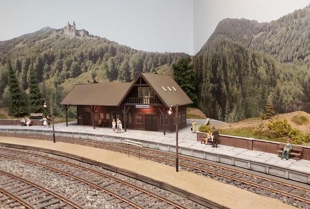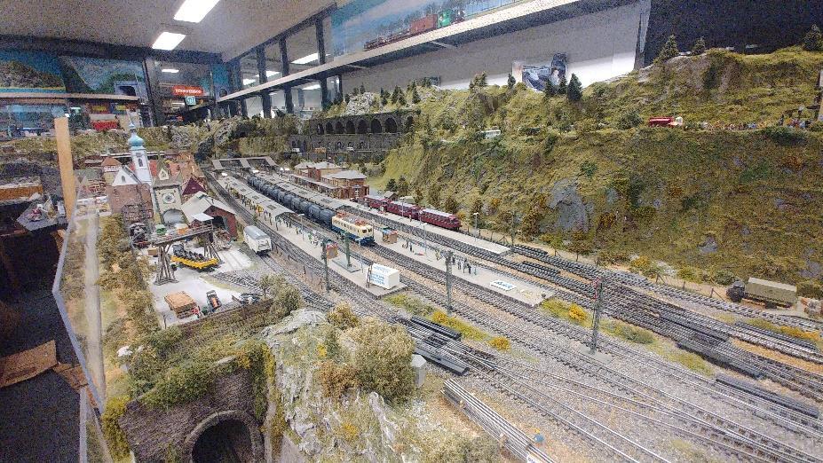 Toen we eenmaal wisten dat het project door kon gaan zijn we gaan kijken welke objecten we graag in het ontwerp wilden hebben. We moeten eerlijk bekennen dat we daarbij ‘gespiekt’ hebben in de catalogus van onze Oostenrijkse vriend. Op die manier hebben we Marco voorzien van voorbeelden, die hij als leidraad kon hanteren. Te beginnen bij de bar (altijd een goed idee) hebben we achtereenvolgens gekozen voor pakhuizen en fabrieken, beboste groene heuvels (met een klein kasteeltje op de top) zie foto 5, zware (spreek vervuilende) industrie met havenkranen en tenslotte de gezellige zwarte zooi van een, om met een goed Nederlands woord te spreken: Bahnbetriebswerk.