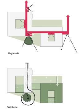 Von öffentlich nutzbarem Grünraum bis hin zu privat nutzbaren Freiräumen. Naturnahe und auch geradlinige Freiraumstrukturen prägen den Entwurf.