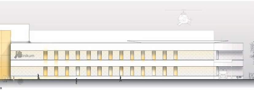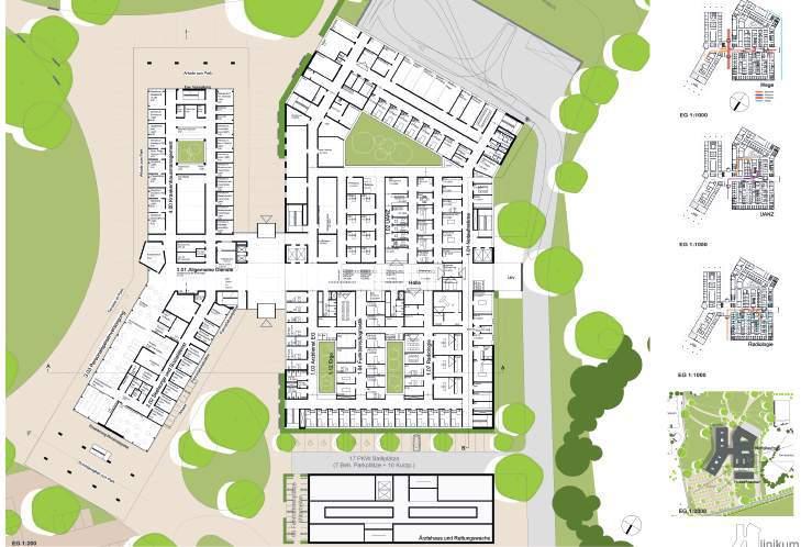 Während die fußläufige Anbindung des Haupteingangs über d W esten erfolgt, so s i n d d ie An lieferu n g u nd d er N eben K r a n k e n w a g e n t r a n s p o rt e getren n t d avon im Sü den gep können von Norden kommend über eine Vorfahrt direkt am ü Hau p tein gan g h alten .
