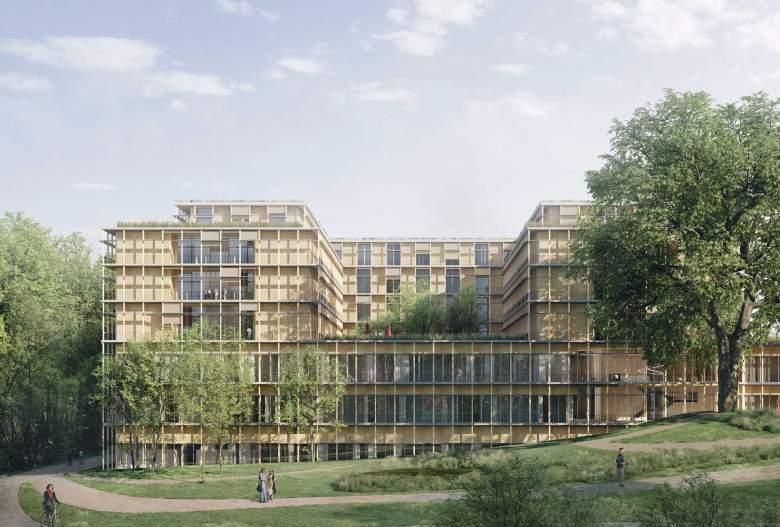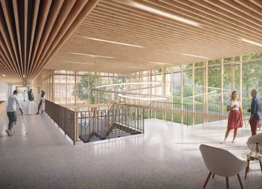 Die Holzstruktur auf der Oberseite des Gebäudes verleiht dem Design eine elegante Note und Nachhaltigkeit, während sie den Eintritt von natürlichem Licht ermöglicht und eine ruhige und friedliche Atmosphäre in den Innenräumen schafft. Die großzügigen Fenster und offenen Terrassen verbinden die Innenräume mit der Außenwelt und laden Patienten und Personal ein, die Schönheit der städtischen Landschaft zu genießen, während sie sich erholen oder arbeiten.