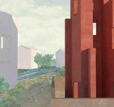 The red core with infrastructures provides users with efficient space for working. The Light Frame, away from the infrastructure, provides users with connections to the views of green space and to the community.