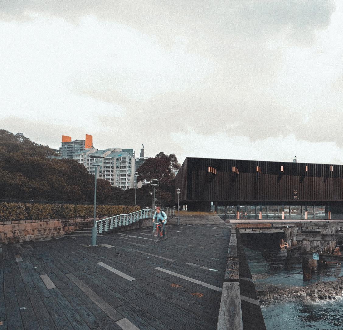 A tidal pool is designed at the location of the original Pyrmont Bathhouse. The tidal pool is accessed by swimming or walking under the preexisting timber platforms, which provides the pool a direct connection to the harbour water, and the harbour bridge. The tidal pool will mainly use filtered water which streams down from the main olympic pool, which will naturally inturn filter the harbour overtime.