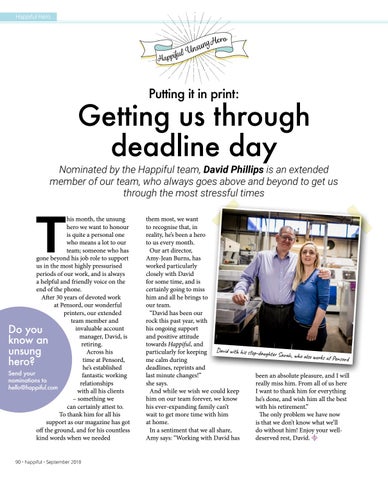 his month, the unsung hero we want to honour is quite a personal one who means a lot to our team; someone who has gone beyond his job role to support us in the most highly pressurised periods of our work, and is always a helpful and friendly voice on the end of the phone. After 30 years of devoted work at Pensord, our wonderful printers, our extended team member and invaluable account manager, David, is retiring. Across his time at Pensord, he’s established Send your fantastic working nominations to relationships hello@happiful.com with all his clients – something we can certainly attest to. To thank him for all his support as our magazine has got off the ground, and for his countless kind words when we needed