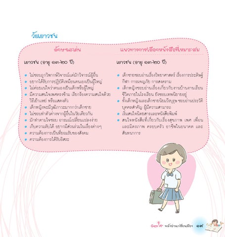 เด็กชายชอบอ่านเรือ่ งวิทยาศาสตร์ เรือ่ งการประดิษฐ์ กีฬา การผจญภัย การสงคราม เด็กหญิงชอบอ่านเรื่องเกี่ยวกับงานบ้านงานเรือน ชีวิตภายในโรงเรียน ยังชอบเทพนิยายอยู่ ทงั้ เด็กหญิงและเด็กชายนิยมวีรบุรษุ ชอบอ่านประวัติ บุคคลสำ�คัญ ผู้มีความสามารถ เริ่มสนใจนิตยสารและหนังสือพิมพ์ สนใจหนังสือที่เกี่ยวกับเรื่องสุขภาพ เพศ เพื่อน และมิ ต รภาพ ครอบครั ว อาชี พ ในอนาคต และ สันทนาการ