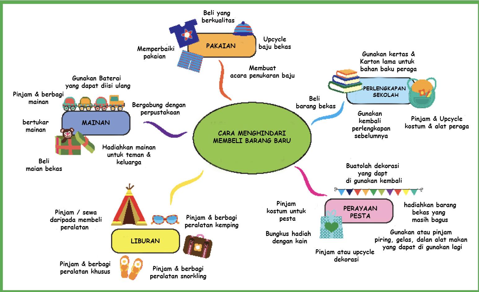 Diskusikan apakah siswa pernah membeli barang yang hanya digunakan sekali atau beberapa kali. Bahas dampaknya: pemborosan uang, menambahkan sampah ke tempat pembuangan akhir, pemborosan sumber daya, dan sebagainya.