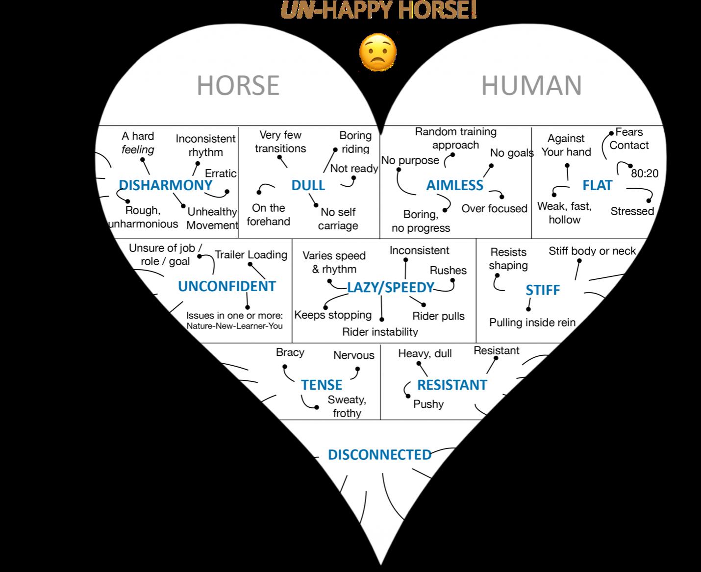 Most horses are disconnected, tense, resistant, spooky, go too fast or lazy, stiff instead of supple, there’s no harmony… and that’s not even covering the more serious problems like bucking, rearing, and bolting When there are problems there cannot be harmony. Interestingly, everywhere Linda went, the list of problems was almost the same She started to mind map the problems and solutions coming up with an excellent heart-shaped, tool for solving just about any difficulty a student might encounter.