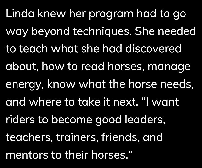 Linda thought long and hard about how she could create a training program beyond anything she had ever seen, experienced, or helped create in the past. Every day for months she poured over the concepts, developed the details, moved things around, and changed the sequence to get better results She tested her new strategies first on herself, on her horses, then with her students and instructors. Every single piece of her new curriculum had to be better, faster, easier, and more empowering, not just a variation of what she’d been doing for the past 30 years The result was a complete blueprint to better horsemanship, training, and riding she called How to Talk Horse