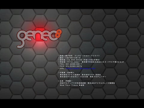 社名:株式会社 ジェネレーション・クリエイト 設立:1998年10月1日 資本金:14,000,000円(平成17年3月現在) 所在地:〒101-0021 東京都千代田区外神田3-8-5 イサミヤ第2ビル4F TEL:03-5289-9977 FA X : 0 3 - 5 2 8 9 - 9 9 7 6 URL:http://www.driving.co.jp/