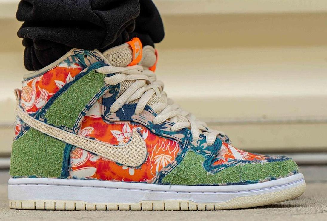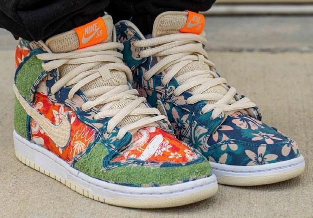 Welcome back Happy Munkey Fam, to another edition of Kickz for the Kulture. All true New Yorkers know when the summer comes around you must have a rare or crisp pair of kicks on the feet. Well, June is the official first month of summer in NYC, so I decided to write about the go-to sneaker of the summer. A lot of heat has released this year already, but none quite as amazing as the Nike SB Dunk High “Maui Wowie.” The Nike “Maui Wowie” also known as the “Hawaii’s” was released on stoner Christmas, April 20th of this year (2021), and already holds the spot as my favorite sneaker of the year. Paying homage to the state of Hawaii, these Nike Dunks are composed of sail, blue, and green aqua colors. The sneakers are covered in a floral pattern which is identical to the classic Hawaiian shirts from back in the day. The real magic of the sneaker is that you can tear away most of the upper part, revealing a deep grassy green and burning orange floral underlays. The newly revealed colors emphasize the 4/20 characteristics of the shoe and colorway.