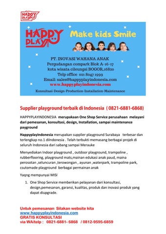 Happyplayindonesia merupakan perusahaan permainan playground anak-anak terbesar dan terlengkap di Indonesia. dari indoor playground, outdoor playground, trampoline park, perosotan anak ,ayunanan ,rubberfloor, playground mats , jogging track . Melayani dari design, pembuatan , pemasangan sampai maintenance . Silakan team kita untuk konsultasi Gratis
