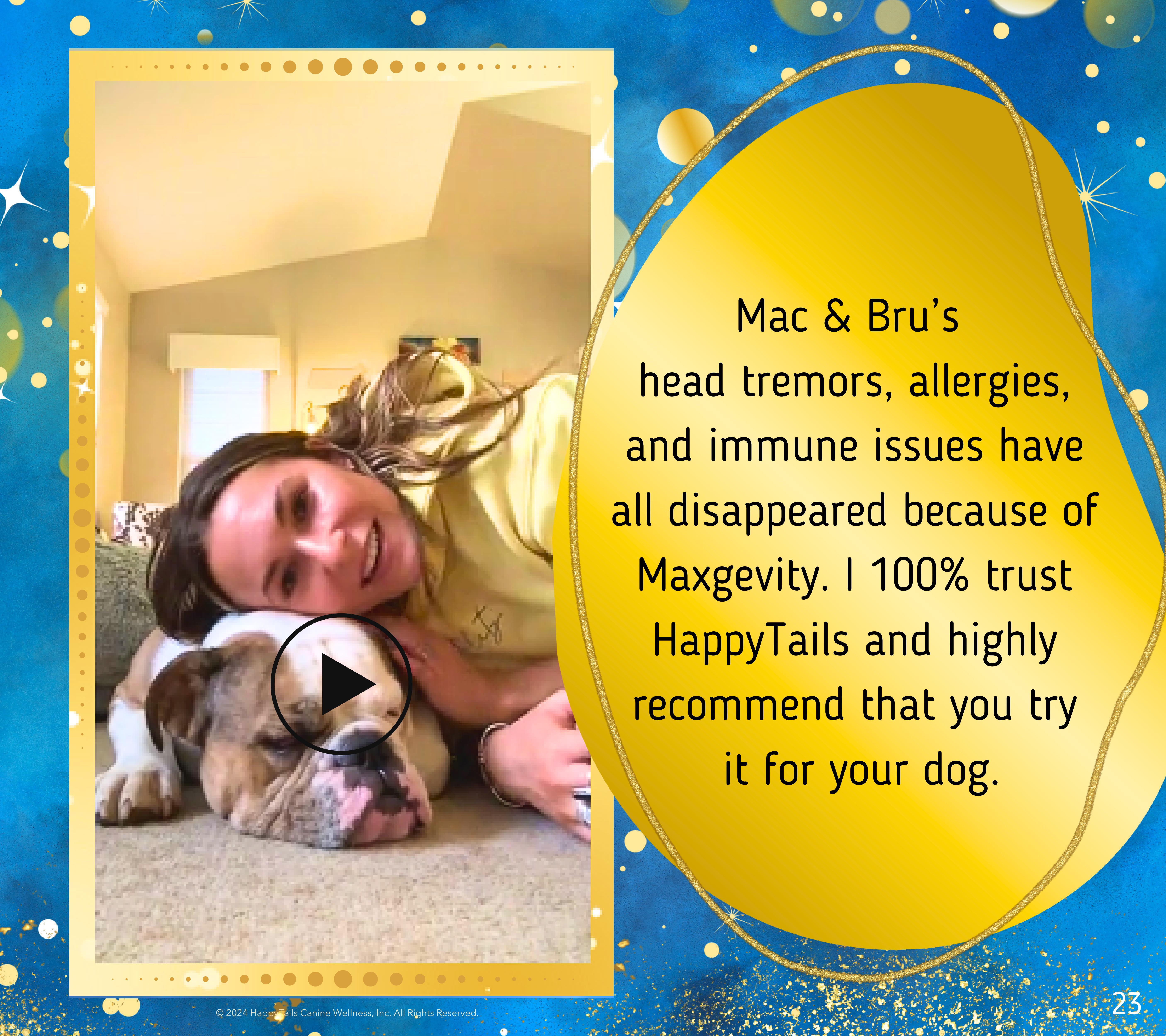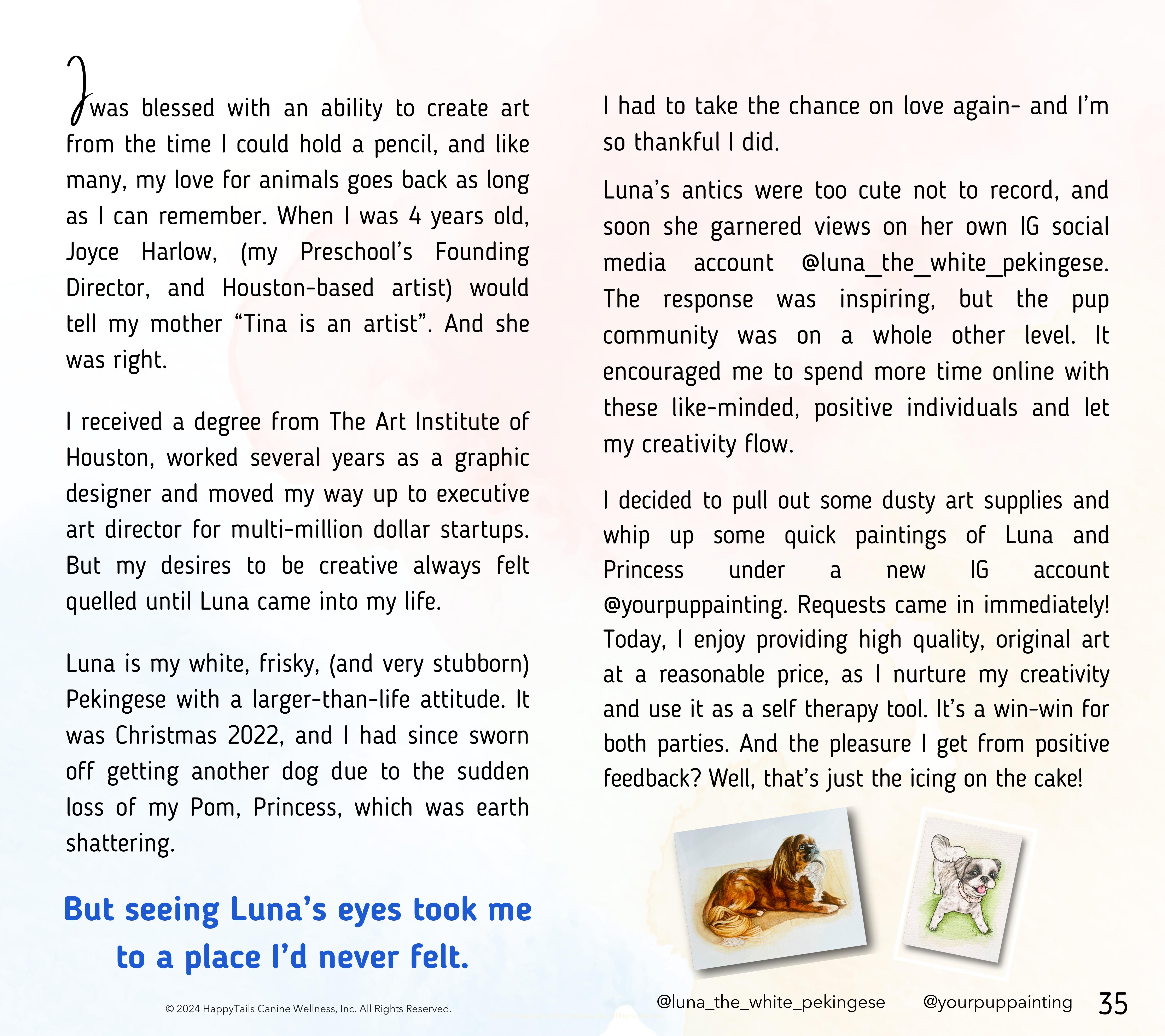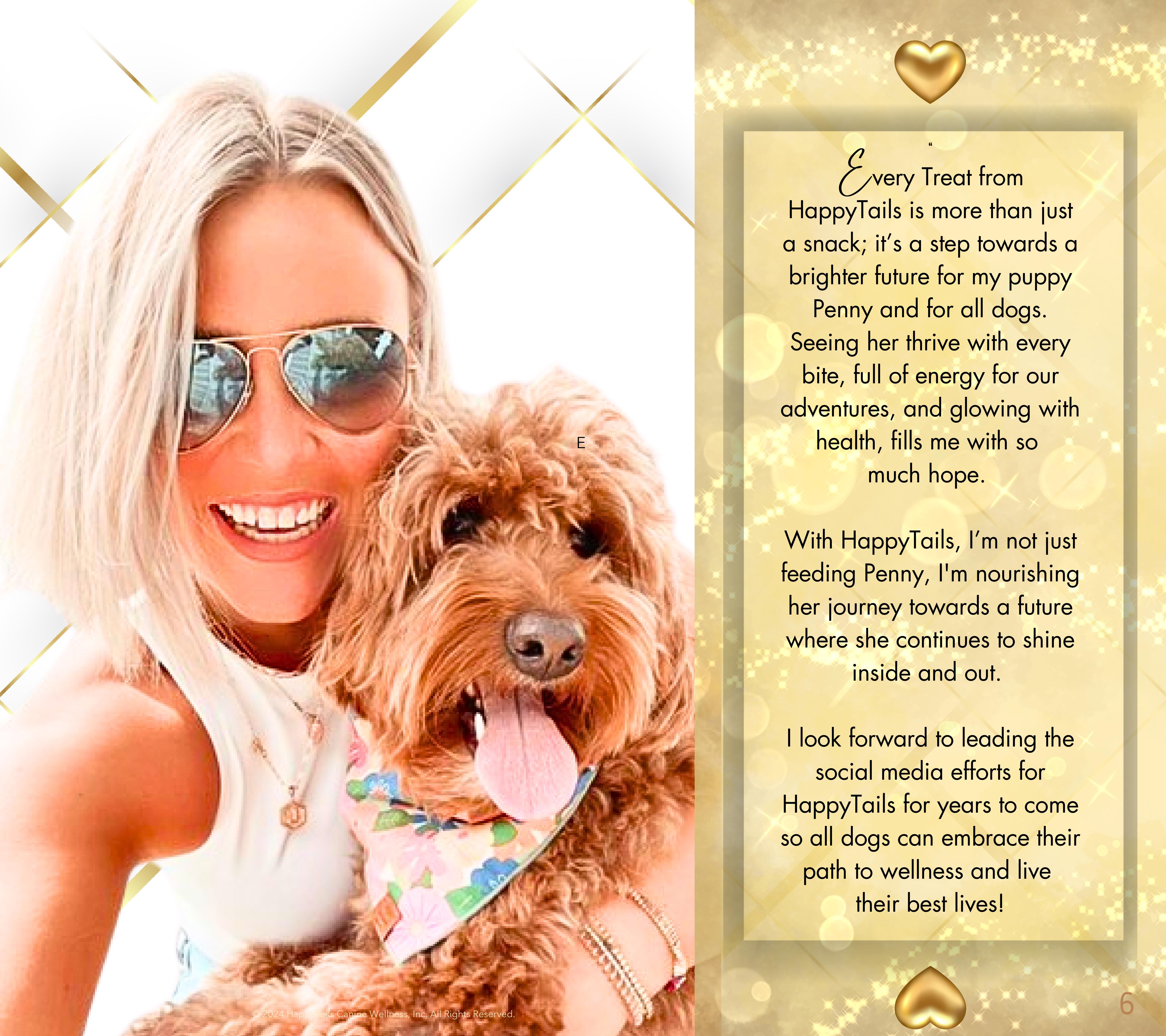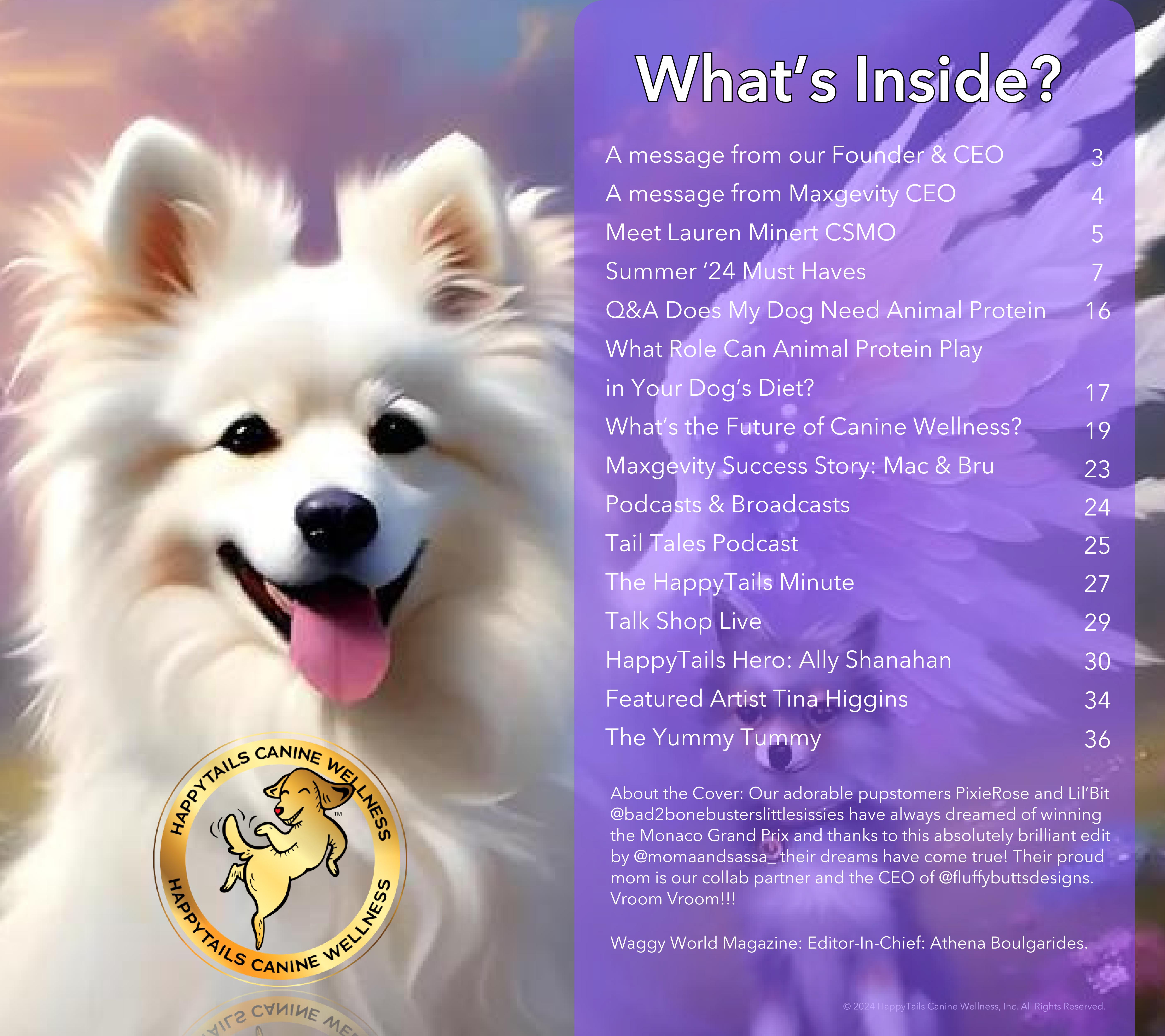 "Welcome to Waggy World Magazine published by HappyTails Canine Wellness. This issue is dedicated to the future of canine wellness and the leadership role that HappyTails is playing in the development of scientifically advanced nutritional products that optimize wellness for every dog in every corner of our world." Founder & CEO, Athena Boulgarides