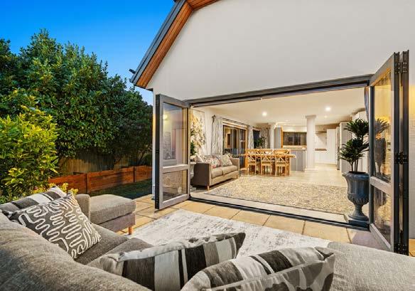 Interconnected living spaces flow across the north, ensuring plentiful sun and seamless connection to sensational al fresco space. A series of French doors and bi-folds open to paved outdoor living that wraps around the house to an in-ground pool.