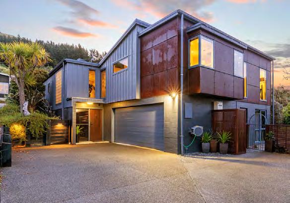 Designed by acclaimed architect Bruce Banbury, its striking blend of Corten steel, concrete block, and board-and-batten cladding creates a bold, contemporary aesthetic that melts seamlessly into its Port Hills setting.