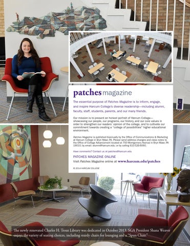 patches magazine The essential purpose of Patches Magazine is to inform, engage, and inspire Harcum College’s diverse readership—including alumni, faculty, staff, students, parents, and our many friends. Our mission is to present an honest portrait of Harcum College— showcasing our people, our programs, our history, and our core values in order to strengthen our readers’ opinion of the college, and to cultivate our commitment towards creating a “college of possibilities” higher educational environment. Patches Magazine is published biannually by the Office of Communications & Marketing at Harcum College in Bryn Mawr, PA. Please send address changes and class notes to the Office of College Advancement located at 750 Montgomery Avenue in Bryn Mawr, PA 19010; by email: alumni@harcum.edu; or by calling 610-526-6060. Have comments? Contact us at patches@harcum.edu