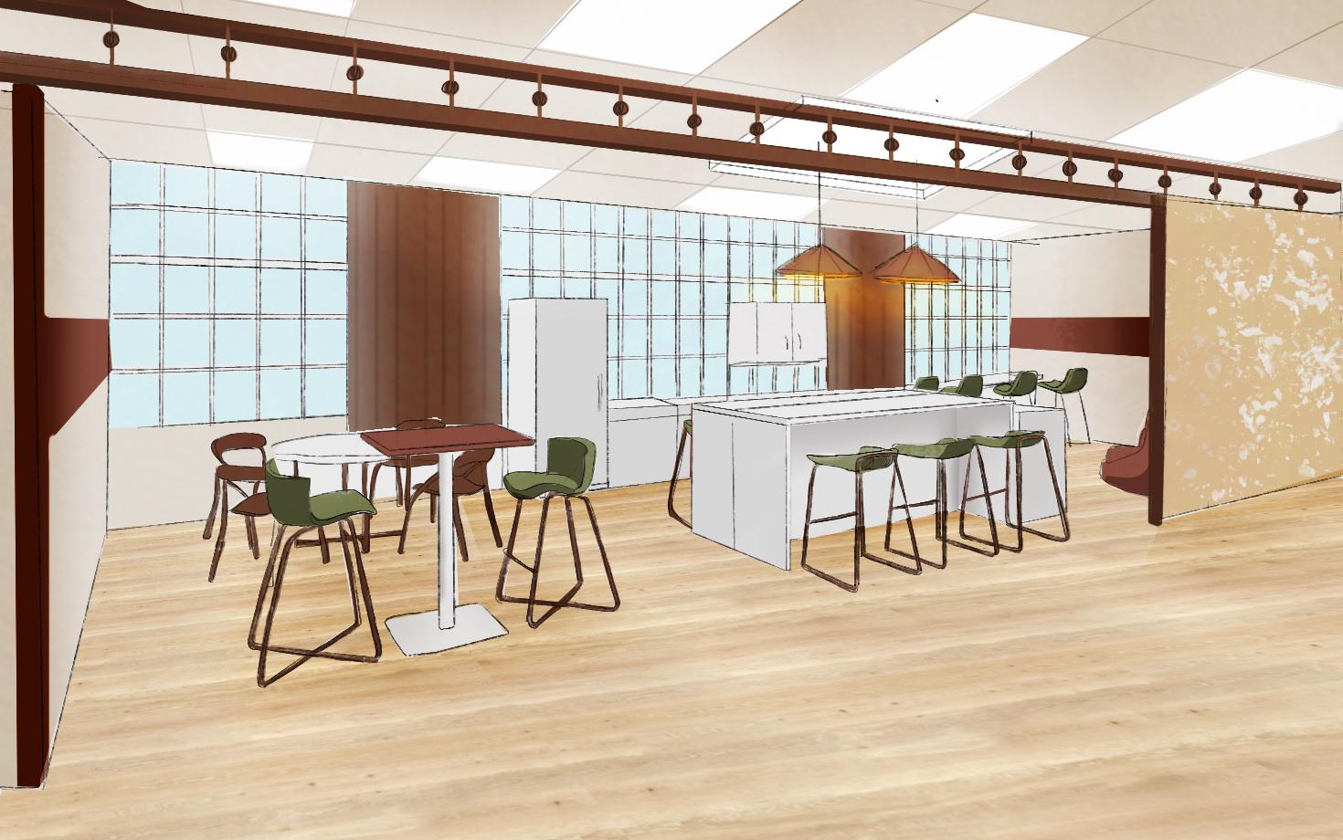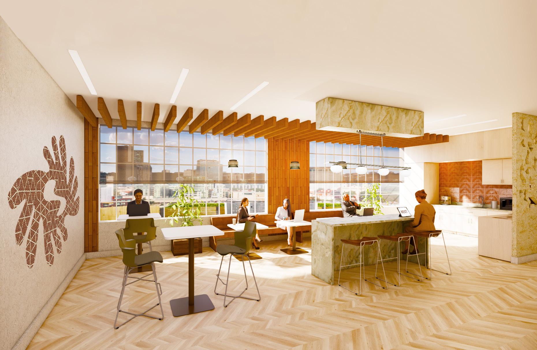 Employees may gather in the Work Cafe to converse with others over coffee or to simply have a change of workplace scenery. This space features various seating options paired with integrated outlets for charging devices. For non-coffee drinkers, a sparkling water bar is available in this space as well as a microwave, dishwasher, sink, and fridge for those preparing lunch during the day.