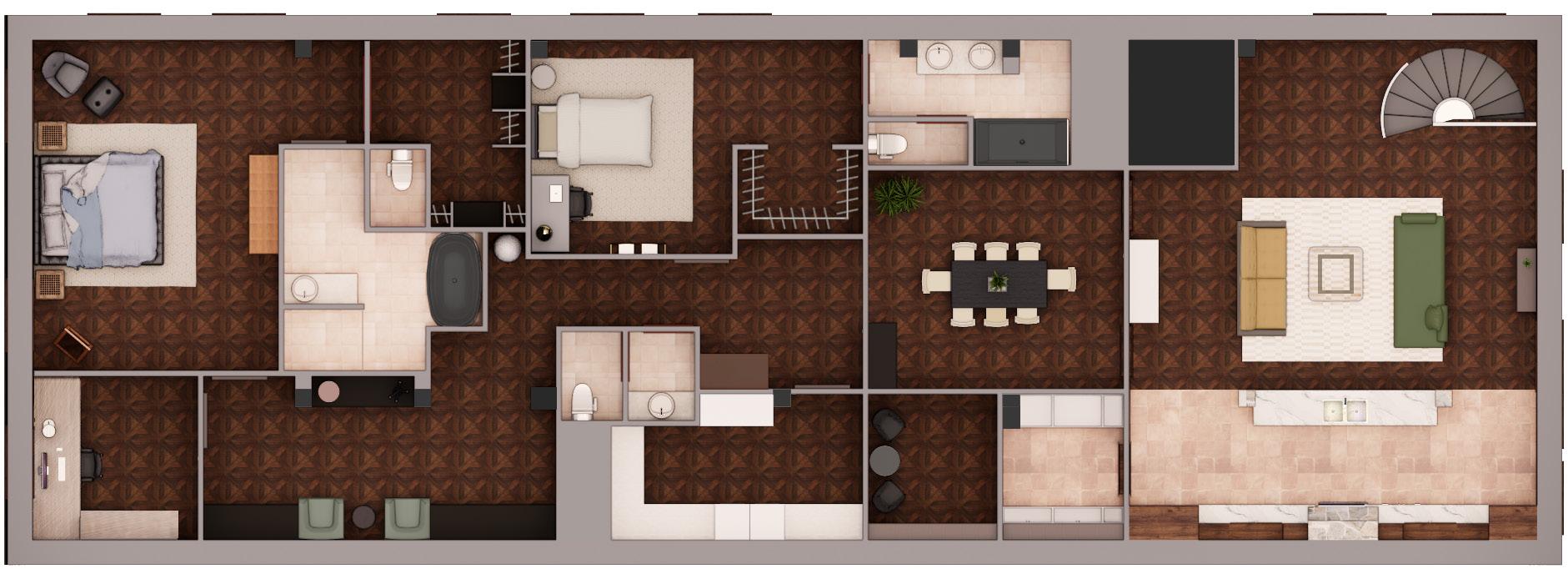 As a lid returns to its bottle, so a person must eventually retreat. Away from public life, the primary suite is complete with a sophisticated full bathroom, walk-in closet, and an adjacent home office. With visually deeper material selections, the private spaces are curated to foster relaxation and focus.