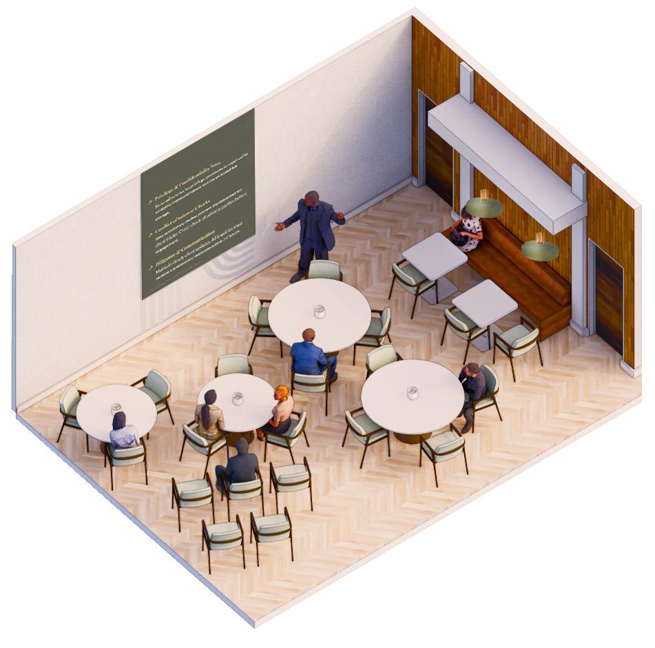 These are the two distinct layouts of the Town Hall space. Each can be adjusted to the users’ daily needs and both can be expanded on at any time by retrieving extra seats from the storage room or borrowing some from the Work Cafe.