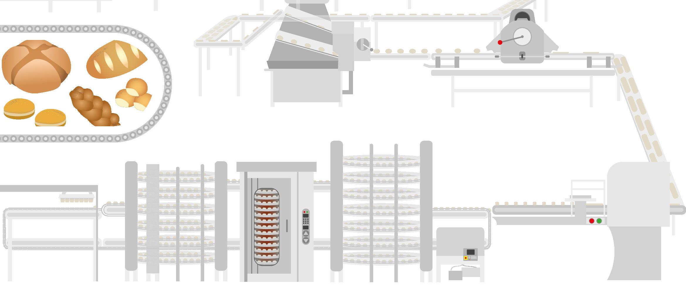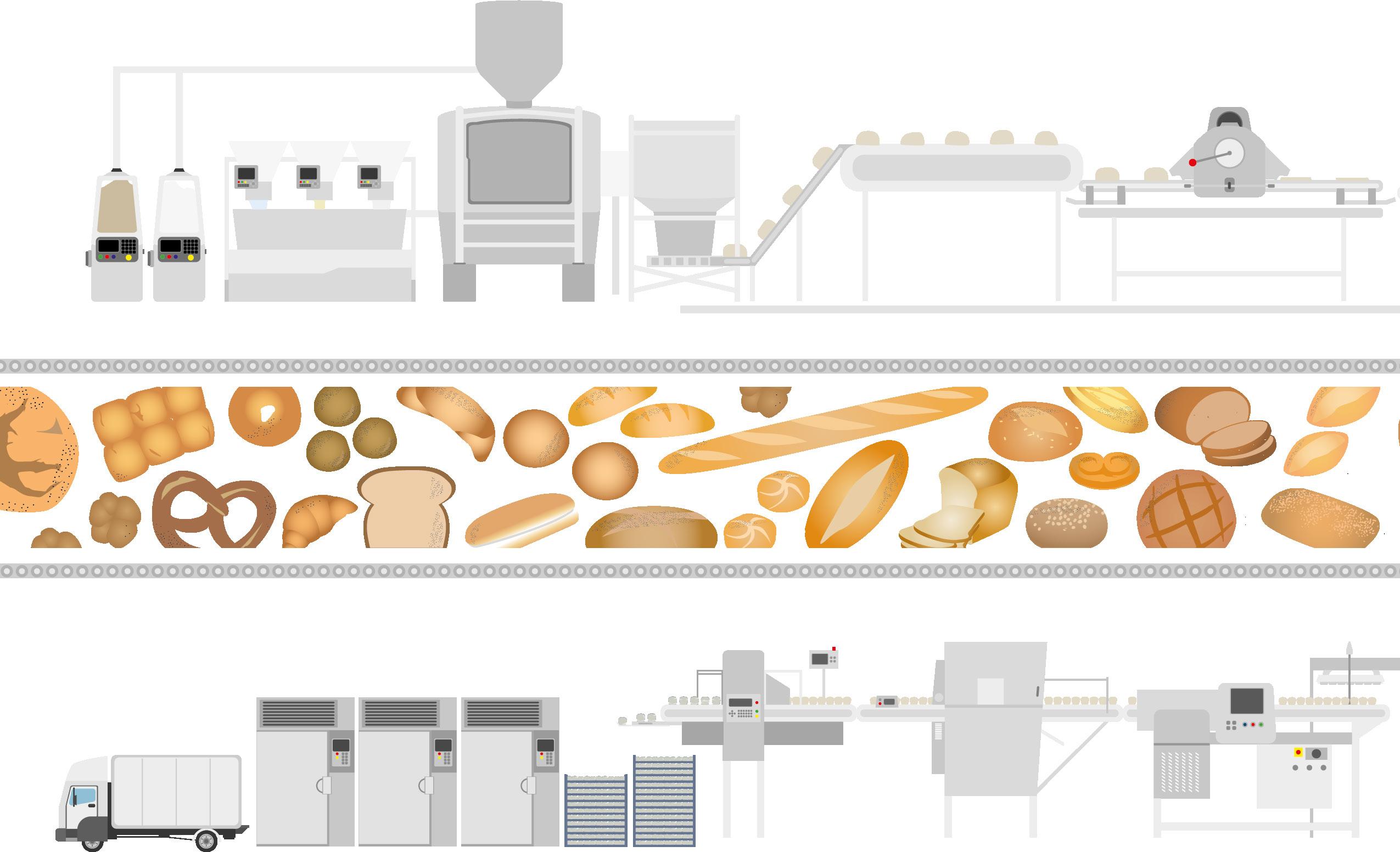 This section illustrates the production and processing of baked goods, focussing on bread products, with a fully detailed production line schematic, so as to provide an understanding of what is involved and where the opportunities lie. Key customer challenges, major product groups, typical maintenance, and improvement projects are identified throughout the line, as well as highlighting potential areas of commercial opportunity for the distributor. This production process, whilst being typical, does not represent how all types of baked goods are produced. This is because actual plant processes may vary according to the type of baked good being produced –such as variety of bread, viennoiserie, patisserie or savoury product – the type of packaging – for example, individual or multi-pack – as well as whether the bakery plant is an industrial or artisan producer.
