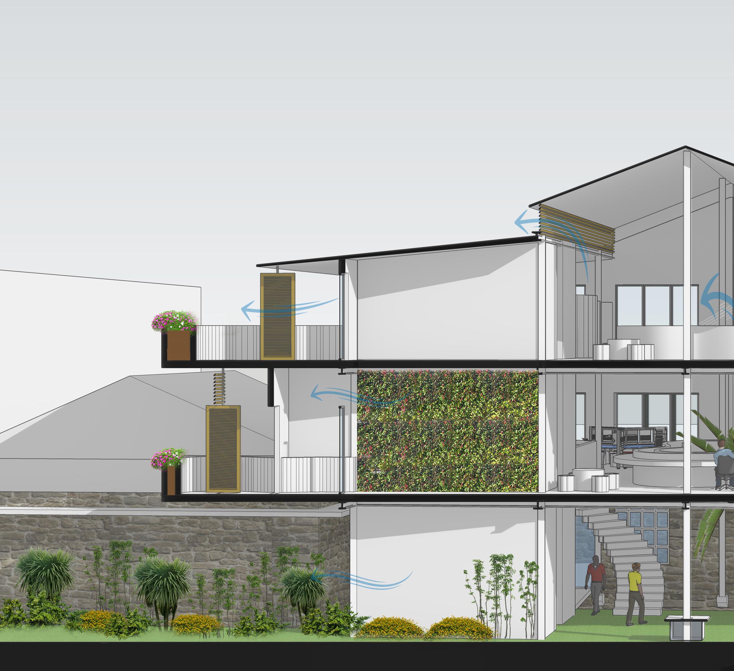 Végétaliser le bâtiment proposé pour combattre le surchauffement et aussi participer à régler le micro-climat. Cela permettrait aussi d’agir comme une liaison et exemple entre les deux ambiances contrastées de la ville.