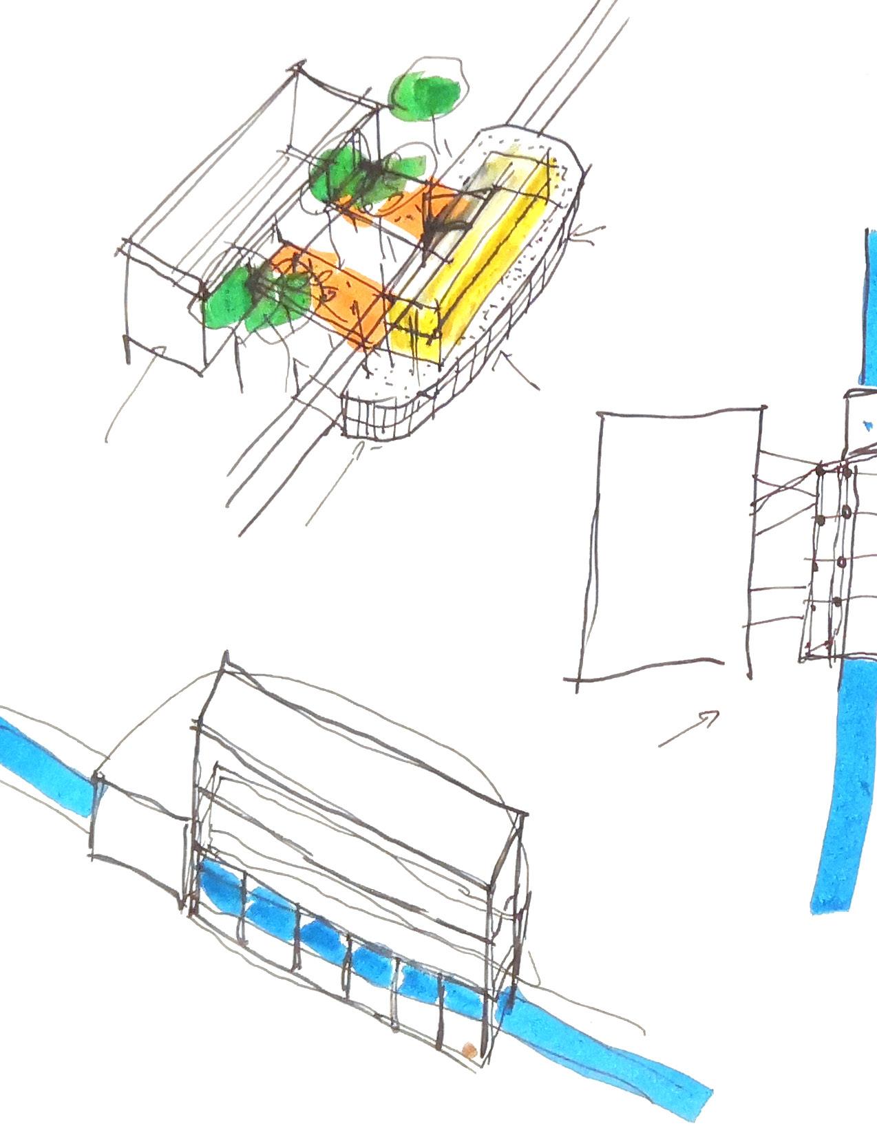 Réutiliser l’existant pour construire et aussi étendre dans l’espace entre les 2 bâtiments. Construire en léger avec l’intention de réversibilité du projet possible dans le futur. La stratégie serait d’utiliser une méthodologie constructive qui devrait être facilement de-constructible pour ré-assembler quelque part d’autre ou que les éléments et matériaux employés pourront être récupérés et réutilisés.
