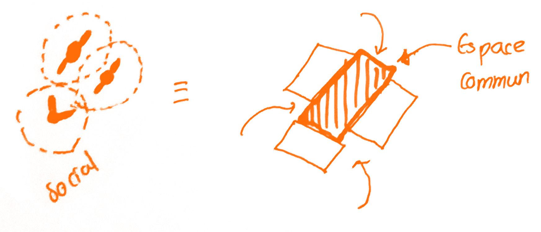 Plus que bâtir la vile sur la ville existante, si on travaillait plutôt avec les espaces interstitiels entre les bâtiments existants en prenant compte de la distance proxémique des usages existantes, il est possible d’insérer des nouveaux programmes complémentaires aux usages de l’existant pour participer dans une économie de proximité, dites circulaire.