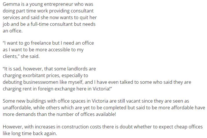 Aujourd’hui dans un article de presse, ils décrient le cout élevé du loyer des bureaux à Victoria pour se lancer dans l’entreprenariat. et le manque de locaux a location flexible. Il y a juste 2 emplacements de coworking space ouvertes en 2020 et 2022 à Victoria.
