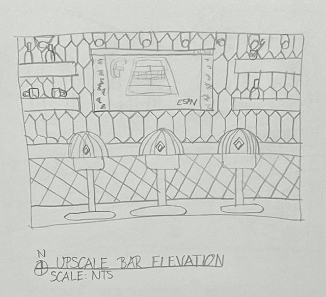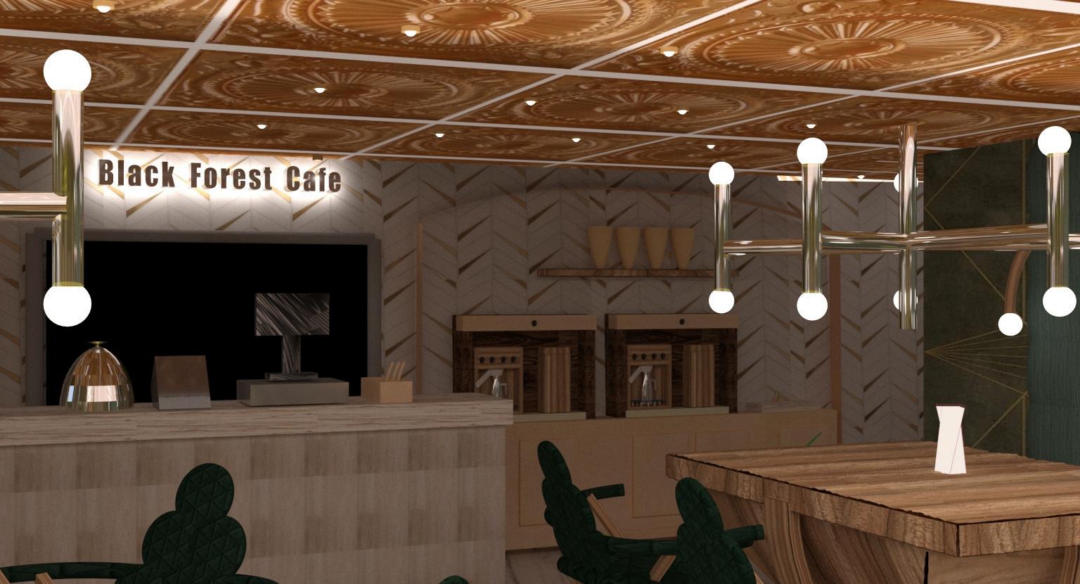Come in and enjoy your wonderful dining experience at the Black Forest Cafe. Many Art Deco features in this cafe are slightly different with the addition of golden, reflective chandeliers that mimic a fancy residential home with a state-of-the-art chalkboard menu, bold color wallpapers, porcelain floor and backsplash tiles that have zero maintenance and last a lifetime. The Black Forest Cafe is a modernized version of Art Deco for colorful, tufted fabric comfortable for guests to eat and grab a cup of coffee. Which guest would not love the glitz and glamour of the copper penny ceiling making it feel historic and memorable for guests to be happy?