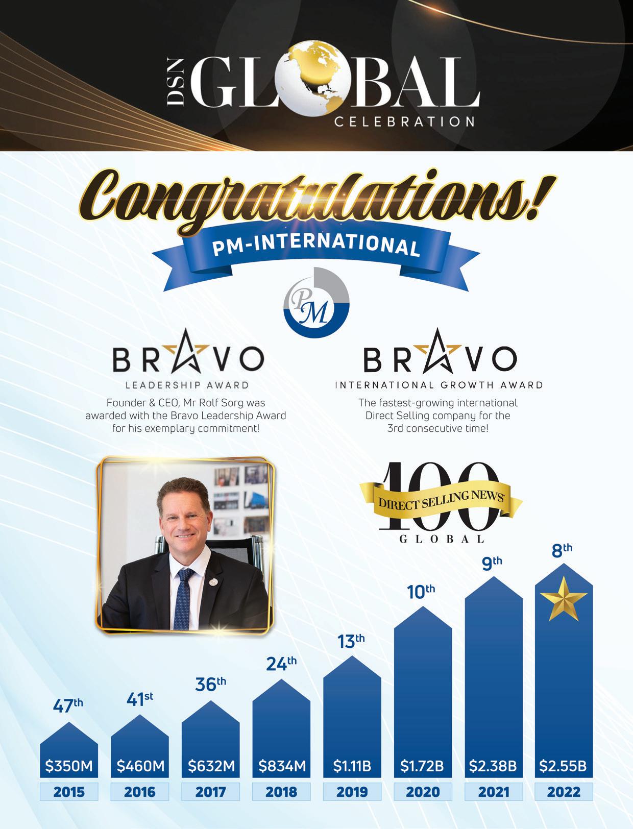 PM-International telah menerima anugerah Bravo International Growth dari majalah perdagangan Amerika Syarikat “Direct Selling News” kerana berjaya menjadi syarikat jualan langsung antarabangsa yang berkembang paling pantas. Ia merupakan salah satu anugerah terpenting dalam industri. Ini merupakan kali ketiga berturut-turut PM-International meraih anugerah ini. Ia disampaikan bersempena dengan catatan skala kedudukan teratas penjualan paling laris di kalangan syarikat jualan langsung sedunia “DSN Global 100” dari segi pendapatan, justeru memberi penghormatan kepada 100 syarikat jualan langsung global dan antarabangsa.