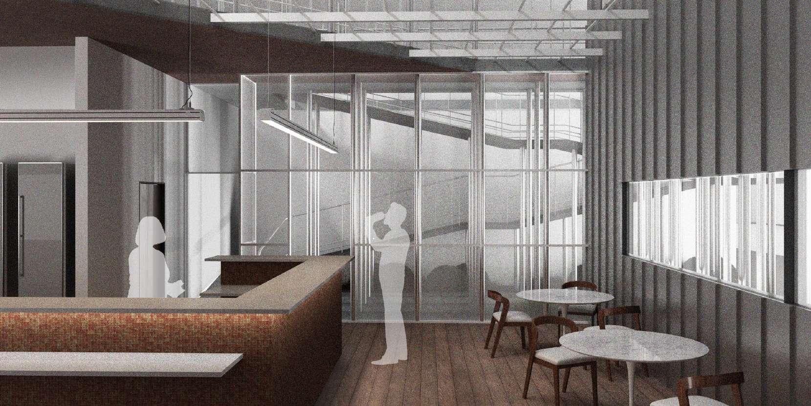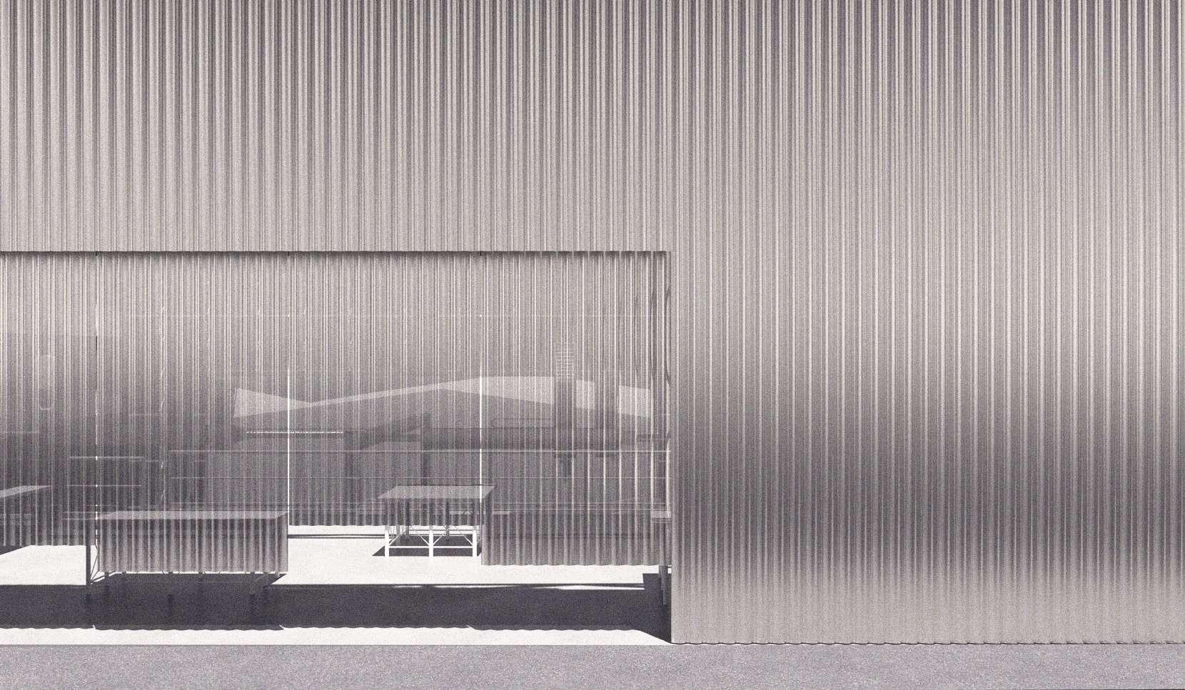 It was crucial to create a connection between pedestrian users and the factory space with translucent materials to engage them. The individually operated doors are perforated stainless steel material to maintain the façades material continuity. During the non-functioning hours of the factory the users can peek into the spaces to engage and understand the experiential quality of the space. The roller doors lift between the trusses and opens a large opening to invite public into the space.