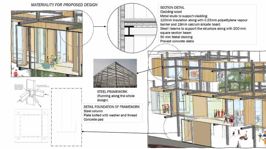 The framework of the design consists of steel columns supported by joinery and holds the form within the structure. This framework is exposed so as to witness the materiality and enhance the aesthetics of the project which gives users a sense of rawness in the experience of the design journey. Due to its exposure, intumescent paint is used as a coating on the steel frames to avoid any fire mishaps and for fire protection.