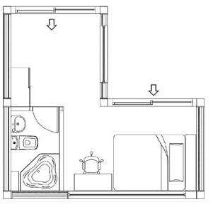Each living unit can expand both vertically and horizontally. The arrangement of the kitchen and living units creates void spaces that can serve as either shared outdoor areas or private outdoor spaces, depending on user needs. For an example of a living unit layout, consider the Type 2 L-shaped living unit shown above, which illustrates furniture placement, including one bathing unit and a designated bed space.