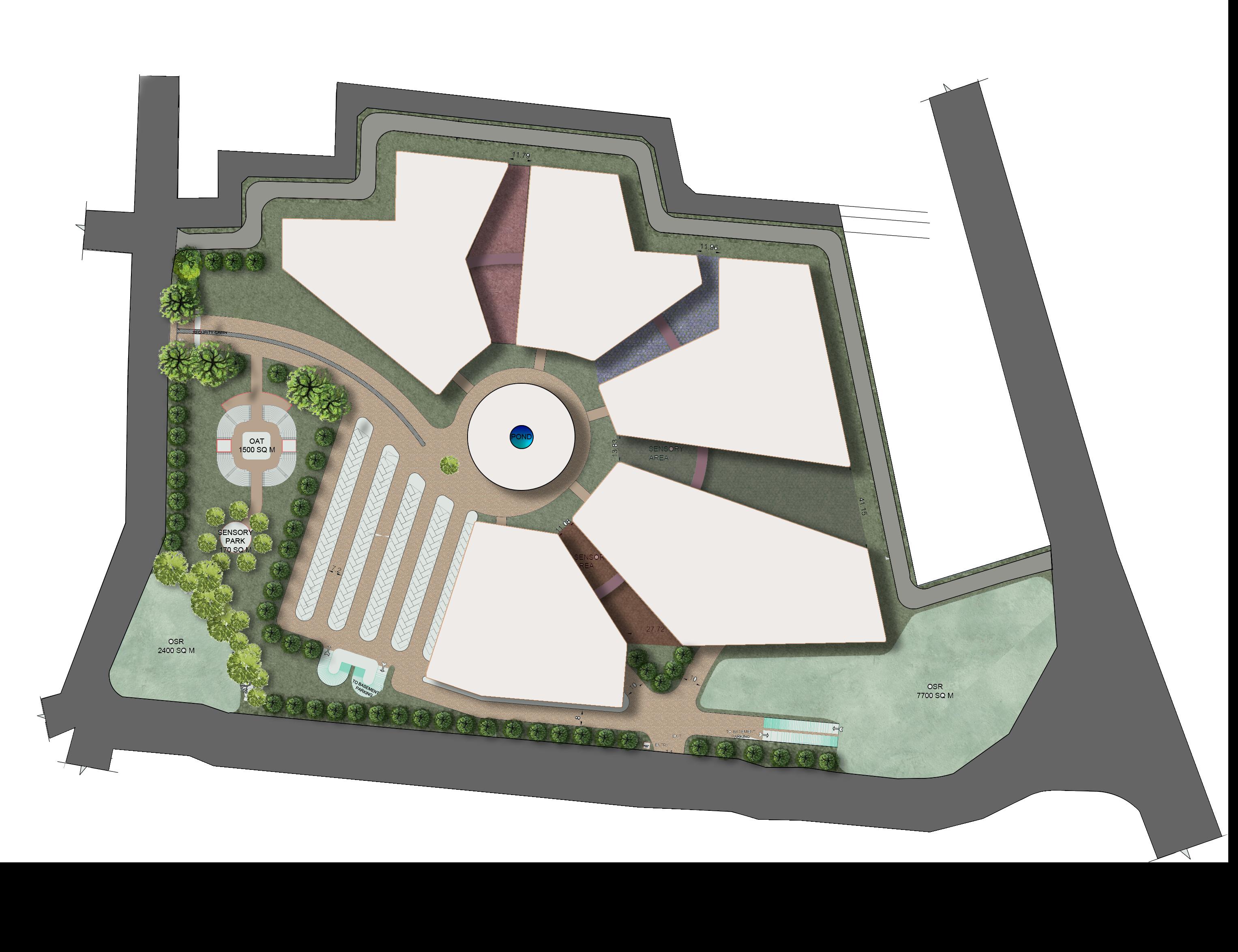 02 01 Entry 04 Ramp to basement 08 Solar Installation 11 Ug Sump 14 Drop off 02 Exit 05 Ramp from basement 09 Terrace 12 Waste treatment plant 15 100 ft Road 03 Osr 06 Service Road 07 Mall 10 Atrium 13 Building Main Entry 01 02 15 03 03 04 06 10 09 08 13 14 08 11 05 03 A B B'