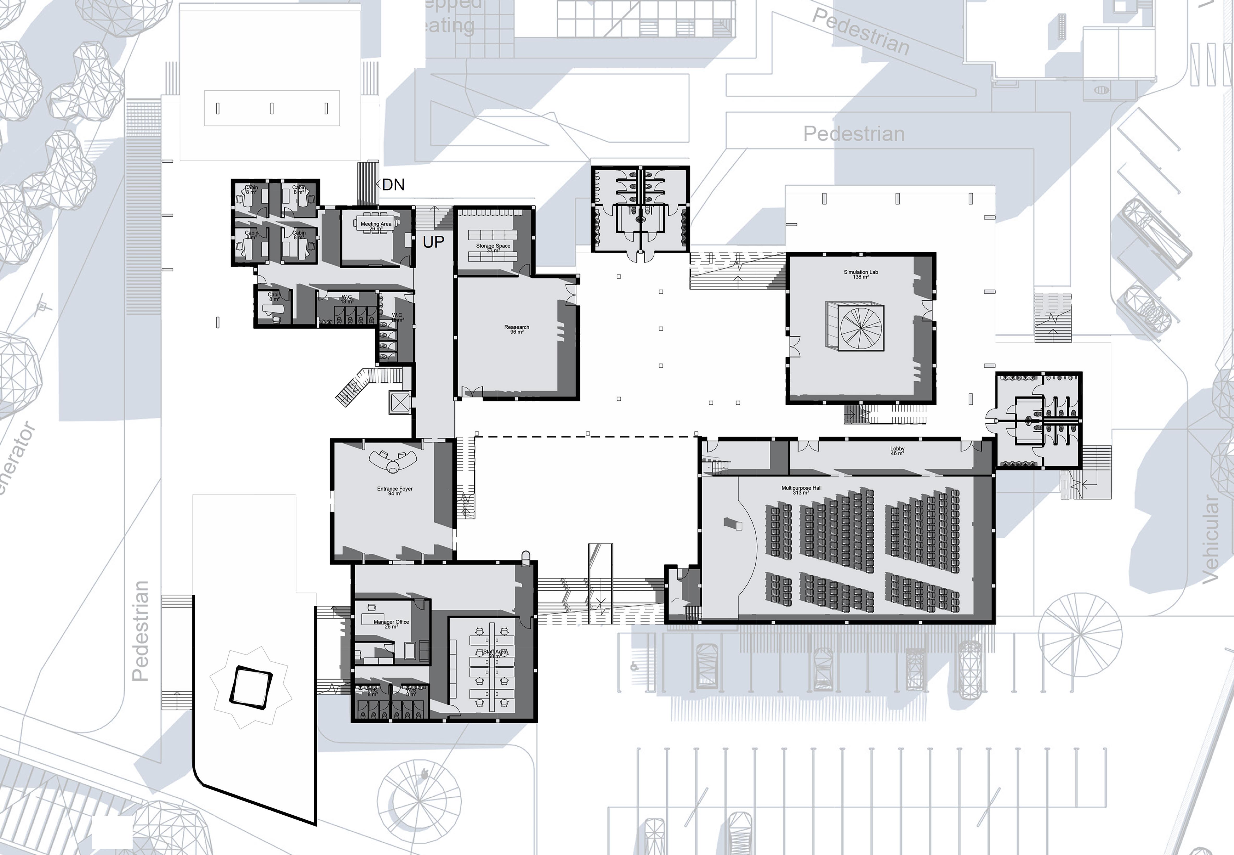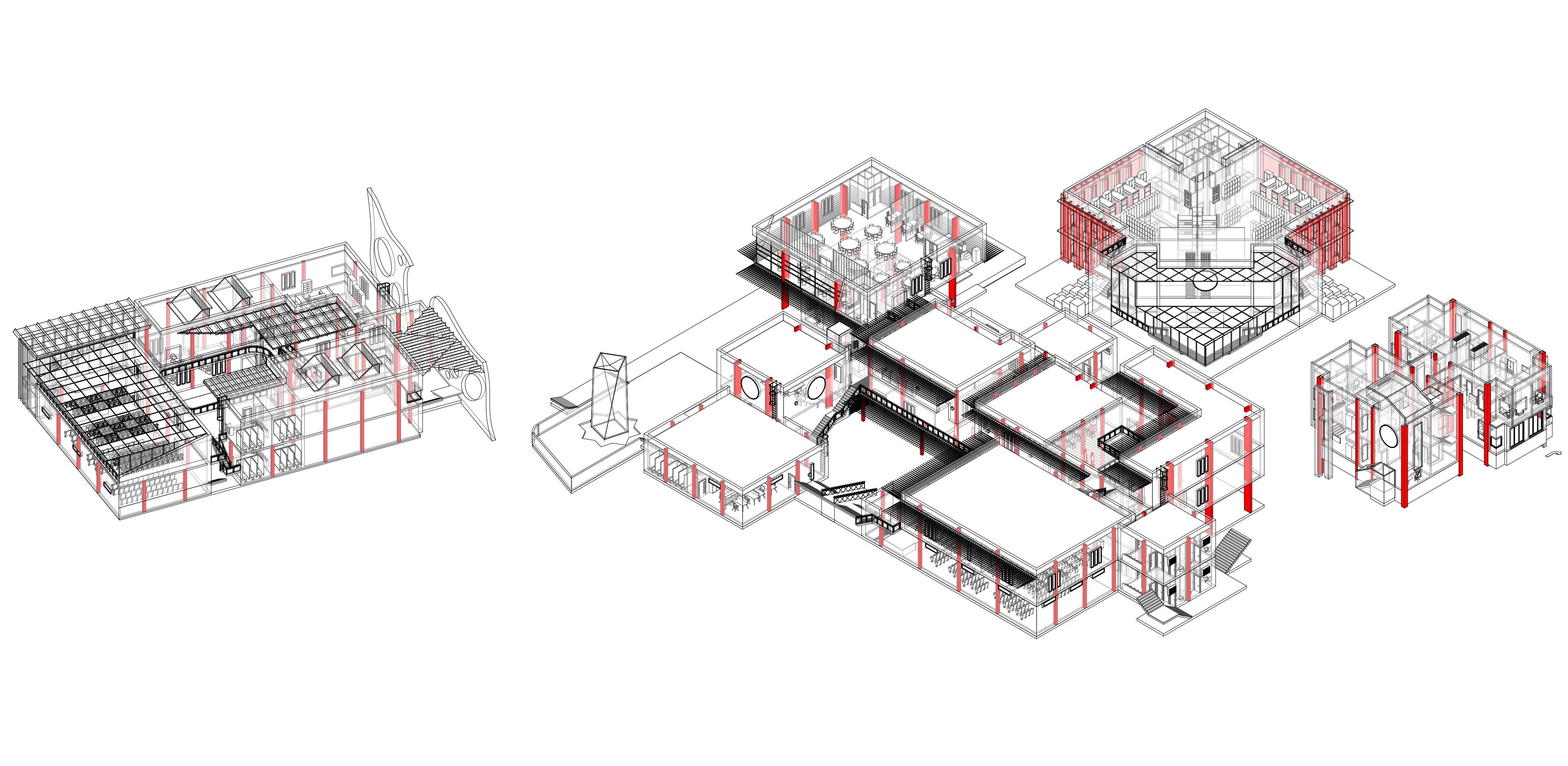 When I was designing the idea was to keep the plan as open as possible. Furthermore, I made sure the building was segregated into public and semi-public parts by placing the public areas in easily accessible locations and the semi-public areas further out of sight. And there are multiple stairs to wander throught the floors with ease.