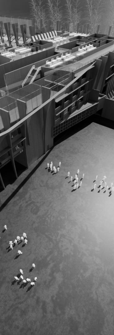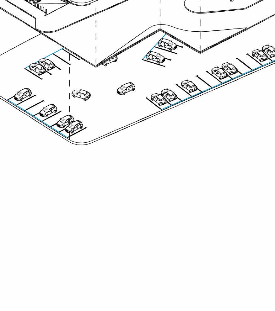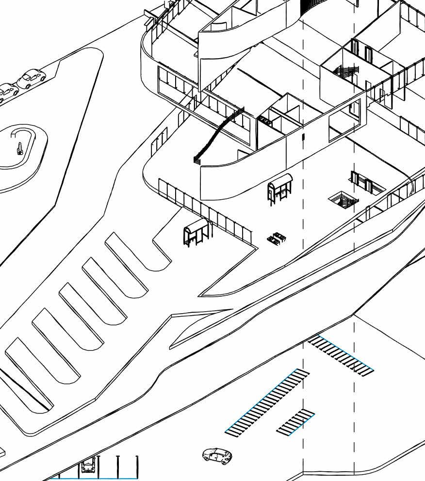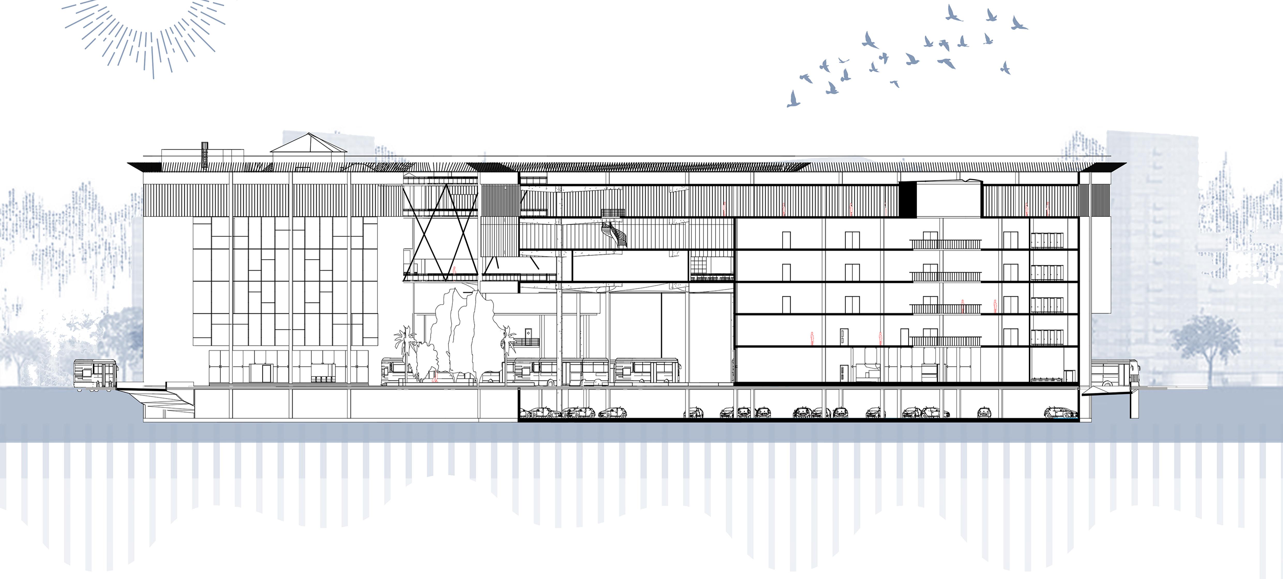 The architectural concept features a cuboid structure divided diagonally to create a dedicated passage for buses. This design not only enhances functionality but also adds a dynamic visual element. The diagonal division ensures efficient bus movement through the block, optimizing space and improving traffic. flow.