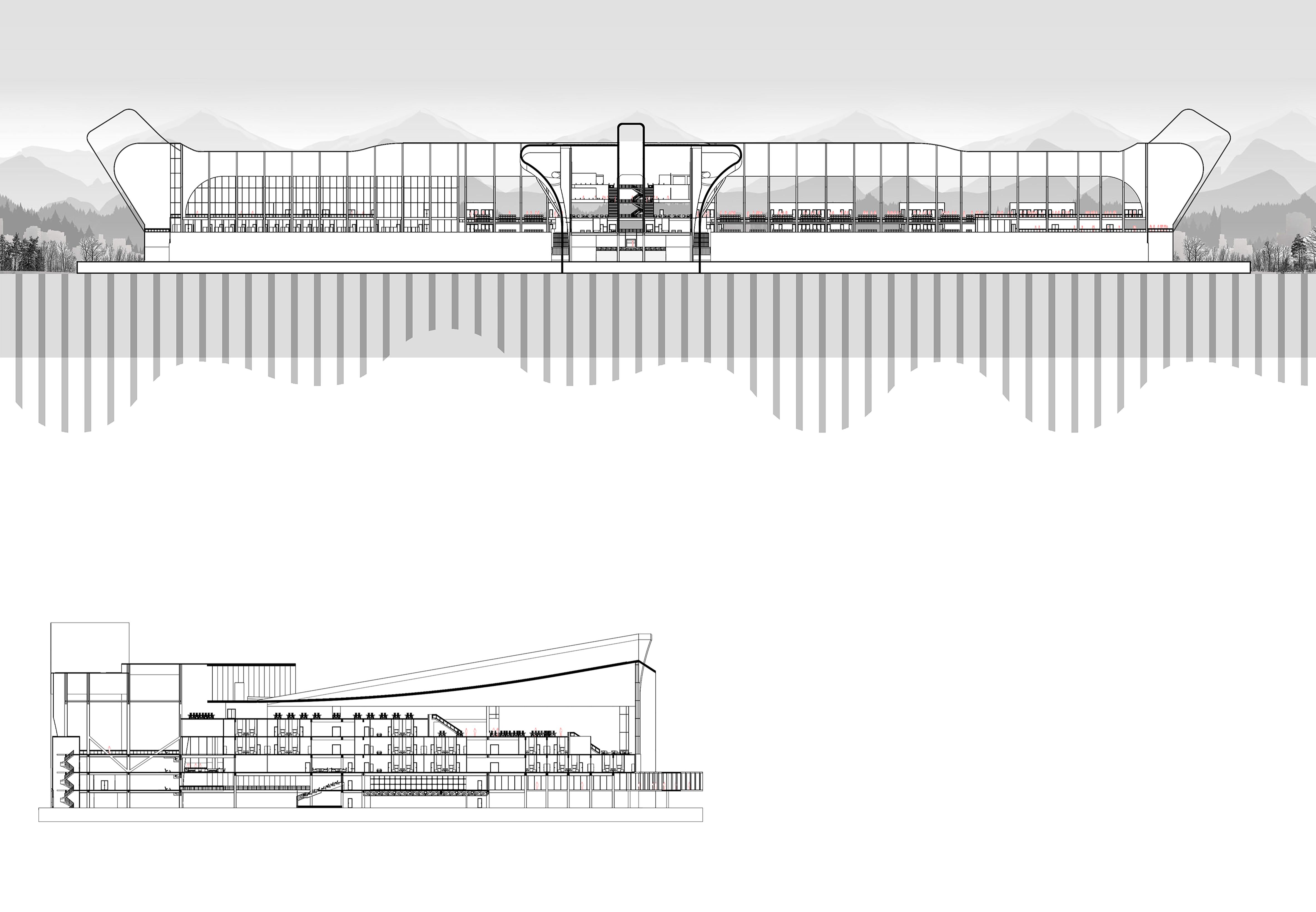 The race control center, elite spectator zones, media center, and garages are located in the longest section of the facility. It serves as the racetrack’s neural network. The restaurants and accommodations are located in the adjacent structure, built over the main starting grid. Light and ventilation are allowed by the atrium, located between the accommodation portions.