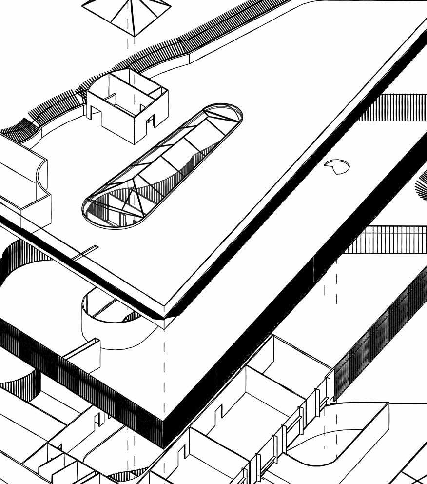 This section displays the stepped layout of the restaurant and accommodation areas. In addition, a series of columns braced with “v” columns support the roof structure.