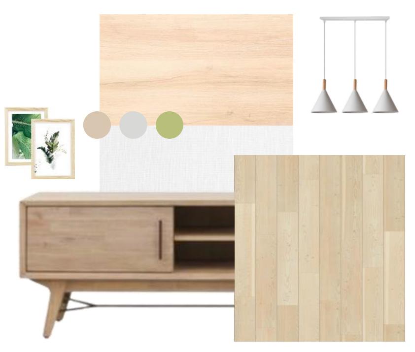 The design features wood and white walls, with lighting for a cozy atmosphere. Minimalist lines and low units complete the minimalistic aesthetic.