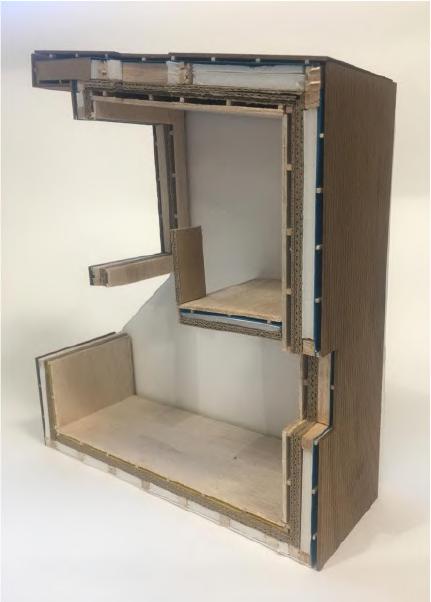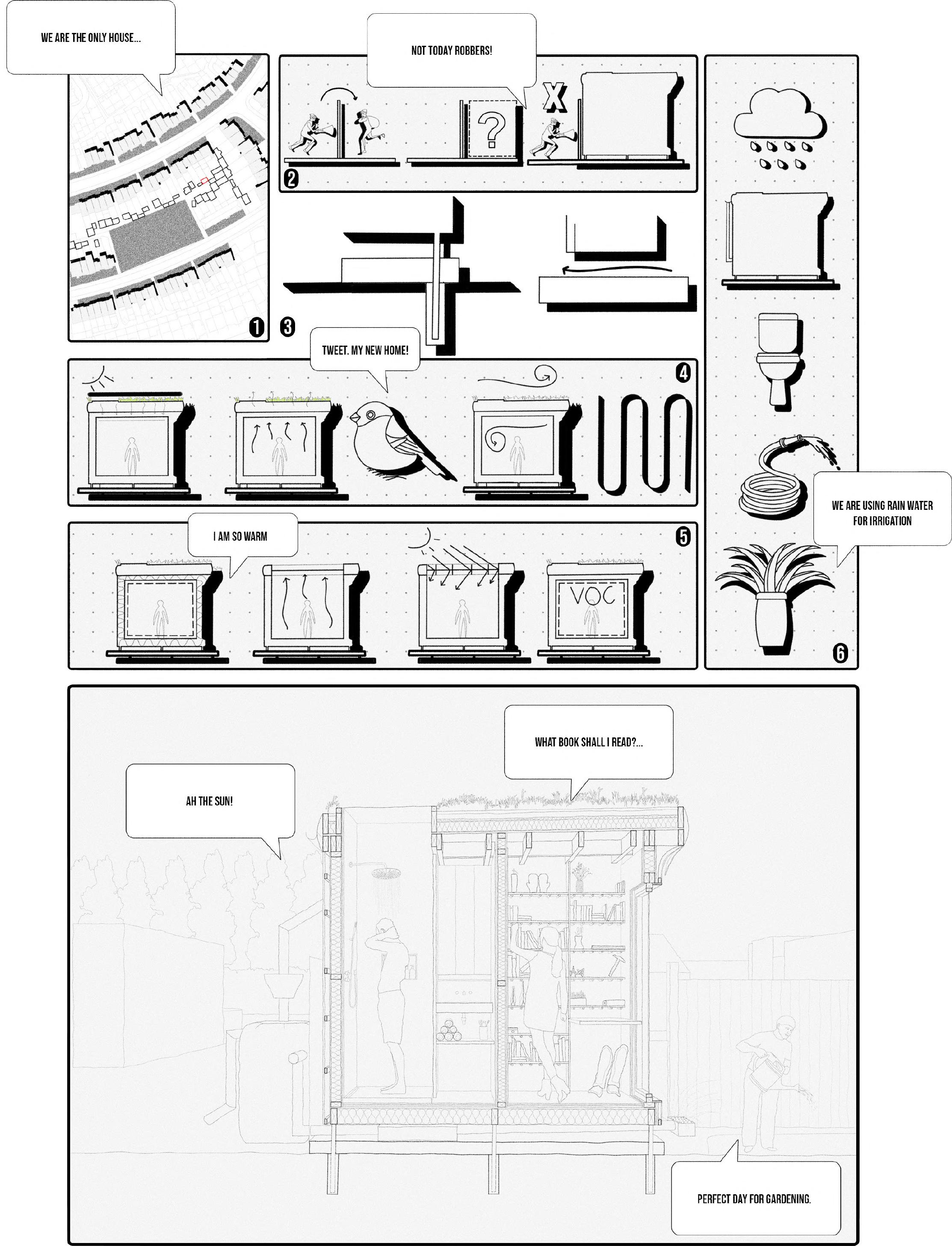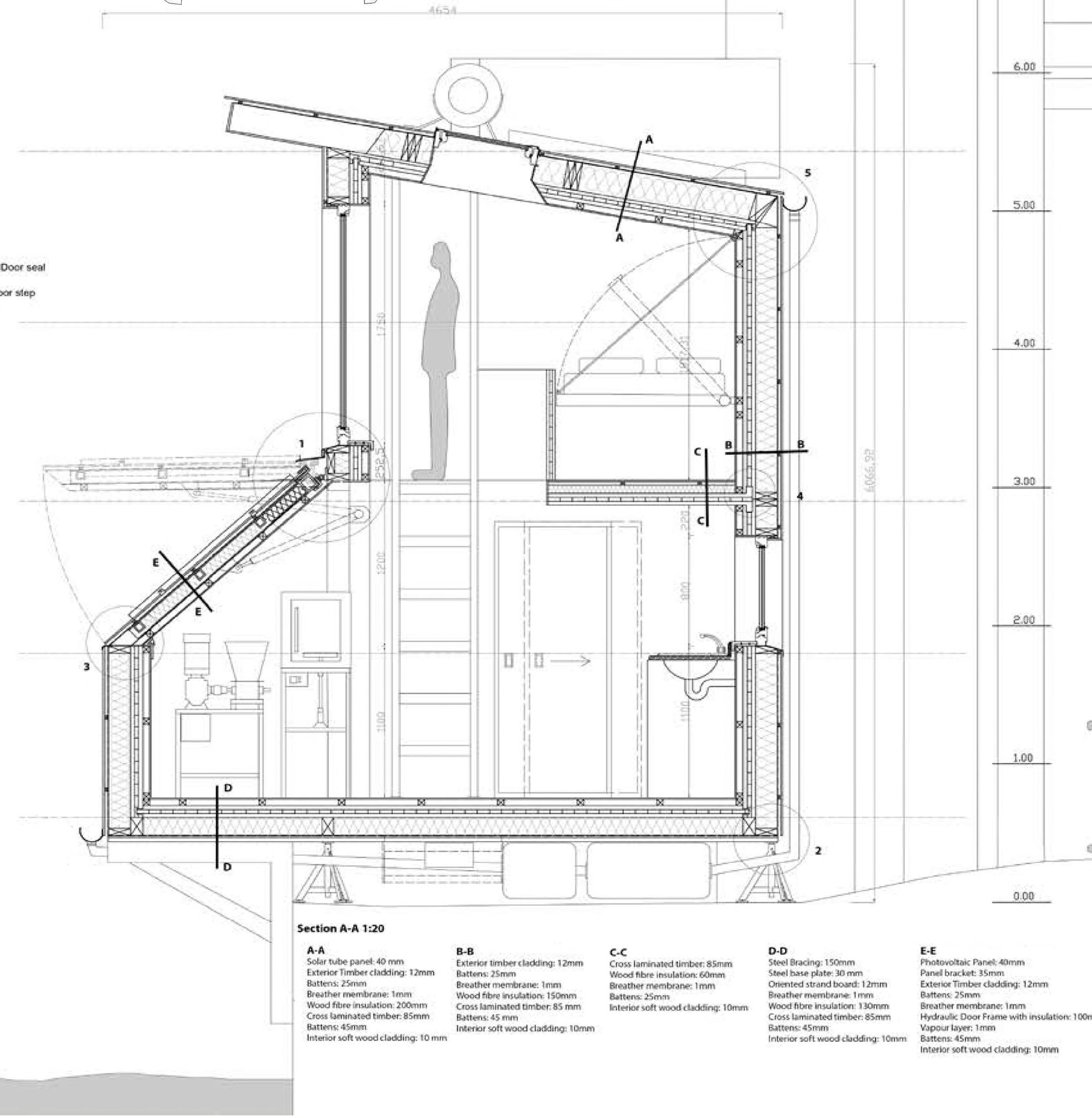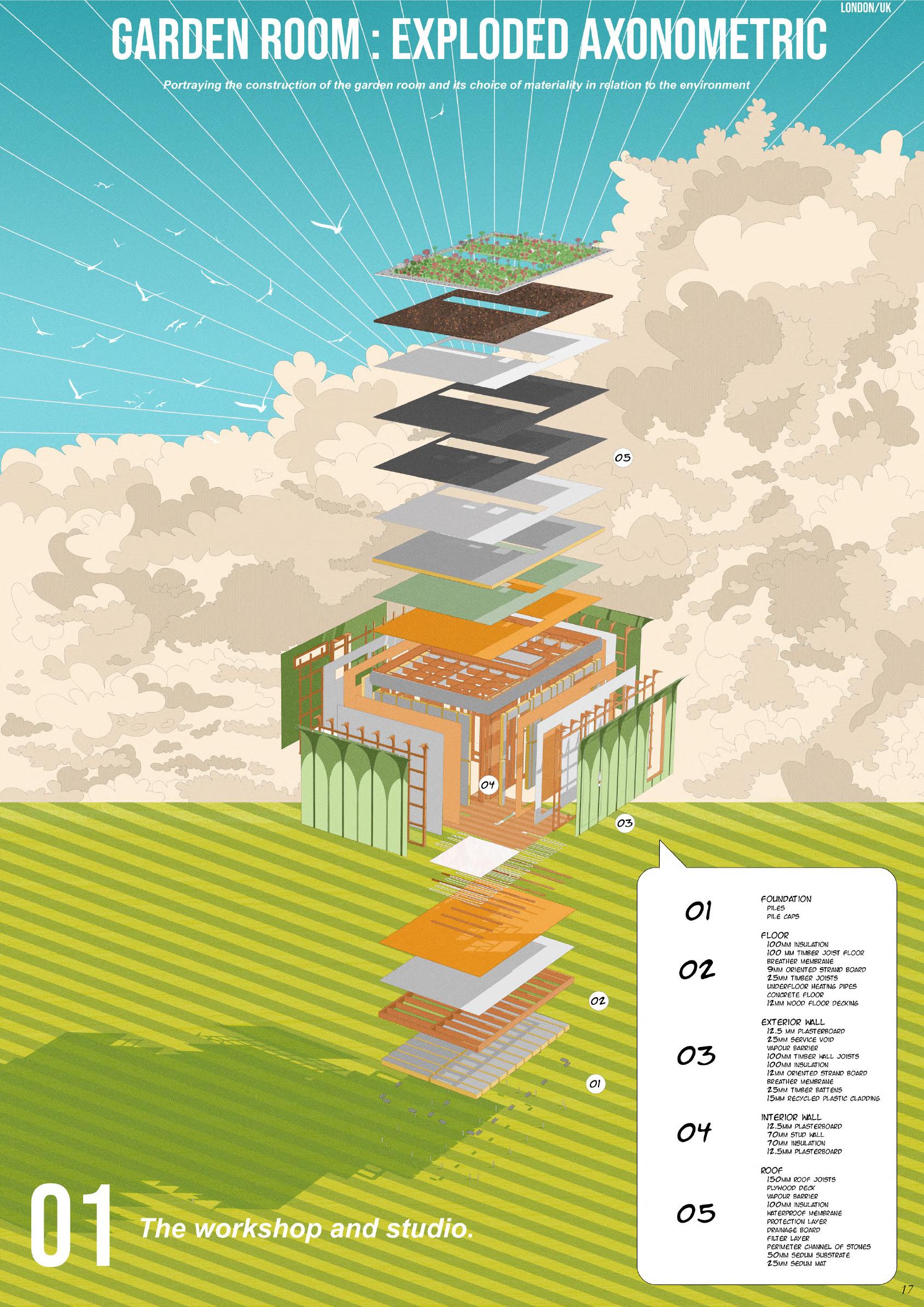 Escape Into The Garden was created to respond immediately and effectively towards COVID-19. Due to the need of more space within homes many people were struggling with separating living from working. As you enter the garden you view the outhouse which aims to blend in with its surroundings on a small site. The choice of cladding resembles what was the first plant in the garden, echoing its form. You are greeted with the workshop space first, then enter through another door into the living and working space. The large roof light draws most of the light into all the rooms. When users enter the studio space they are able to look straight out onto the garden whilst working. The roof light not only draws in the light but also nature which makes for dramatic shadows being cast around the outhouse.