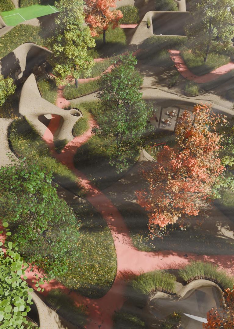 At the core of the design is a commitment to inclusivity. The architecture draws inspiration from sensory development tools, with spaces that promote motor skills, balance, and tactile exploration. Each room varies in shape, avoiding repetition and encouraging children to engage with their environment in a new way each day. Curved, soft walls throughout the school create a safe and gentle atmosphere, eliminating sharp corners while subtly guiding movement and curiosity.