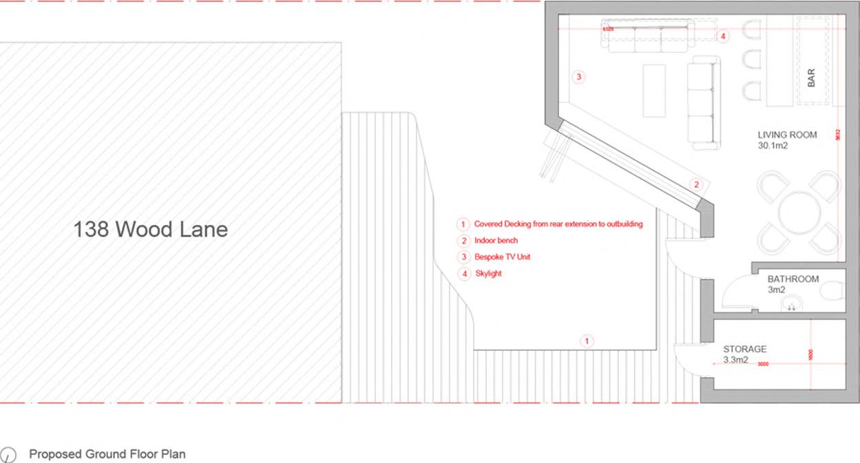 Managed project. Proposed Initial concept design and planning application drawings. The brief was to create an outhouse that the clients and their children could invite their friends over to. Permitted development and full planning proposals were presented.