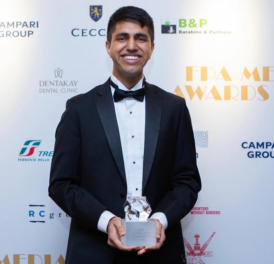 INNOVATIVE INSIGHT Simar Bajaj (‘20) accepts the Foreign Press Association’s 2022 Science Story of the Year Award for his insightful story on pig to human heart transplants.