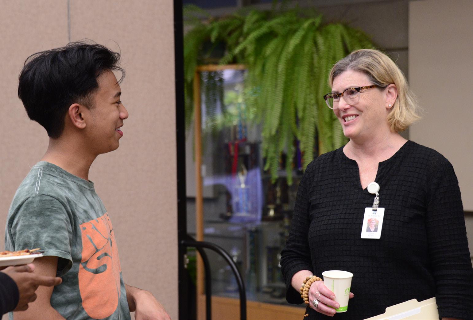 SHAREEN CHAHAL HISTORY TALK Kris Estrada (12) and Near Mitra Co-Director Donna Gilbert chat during the Scholar Grant Reception on Tuesday. At the event, Near Mitra scholars presented on their respective research projects. WORDS OF THE WISE Co-News Editor Felix Chen (10) and Winged Post Editor-in-Chief Kinnera Mulam (11) interview keynote speaker Peter Hartlaub on April 20. Harker Journalism enhanced its skills in workshops and received awards in the JEA/NSPA Convention.“I admire how hard [the scholars] work, balancing this giant project with all their other commitments”