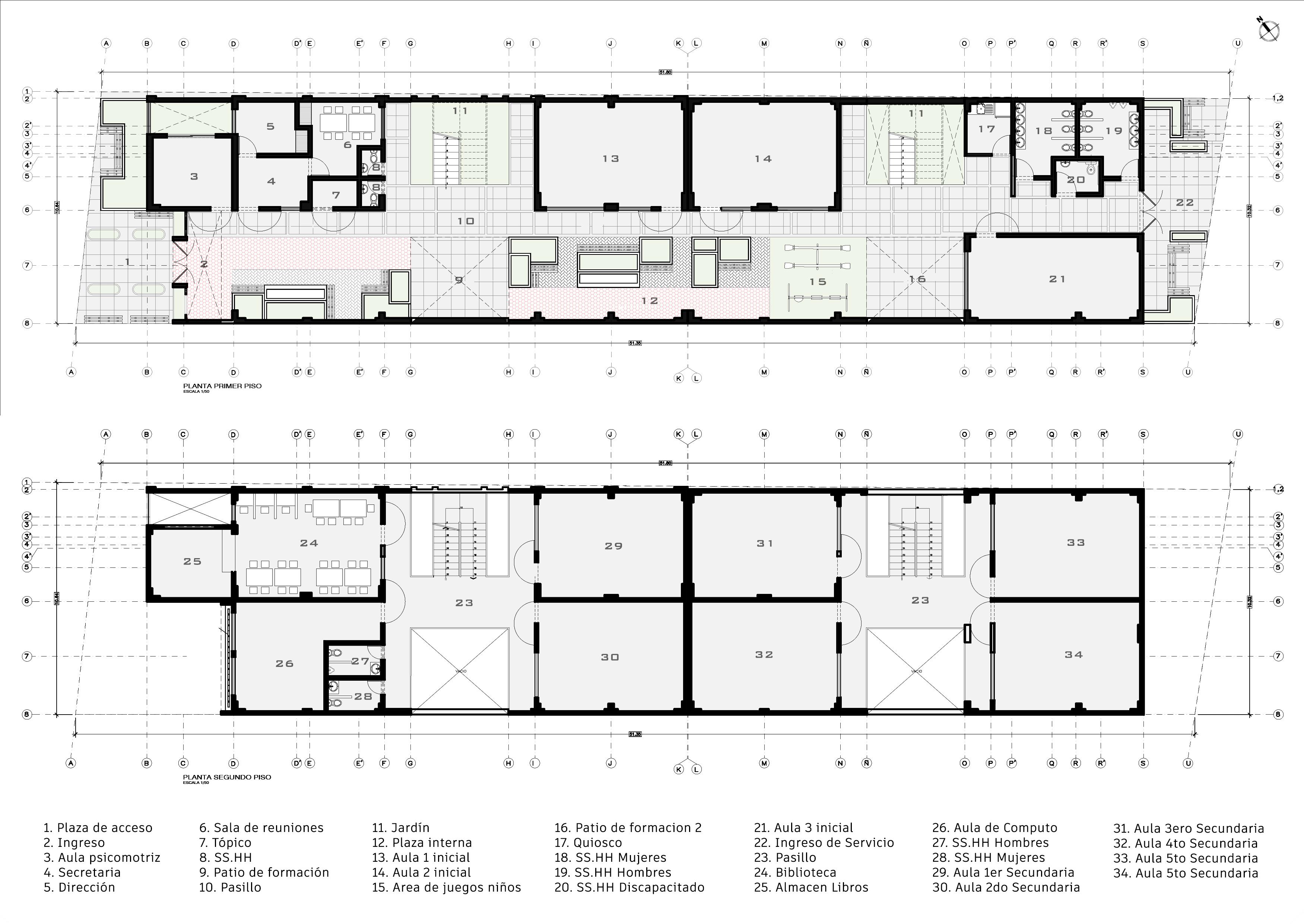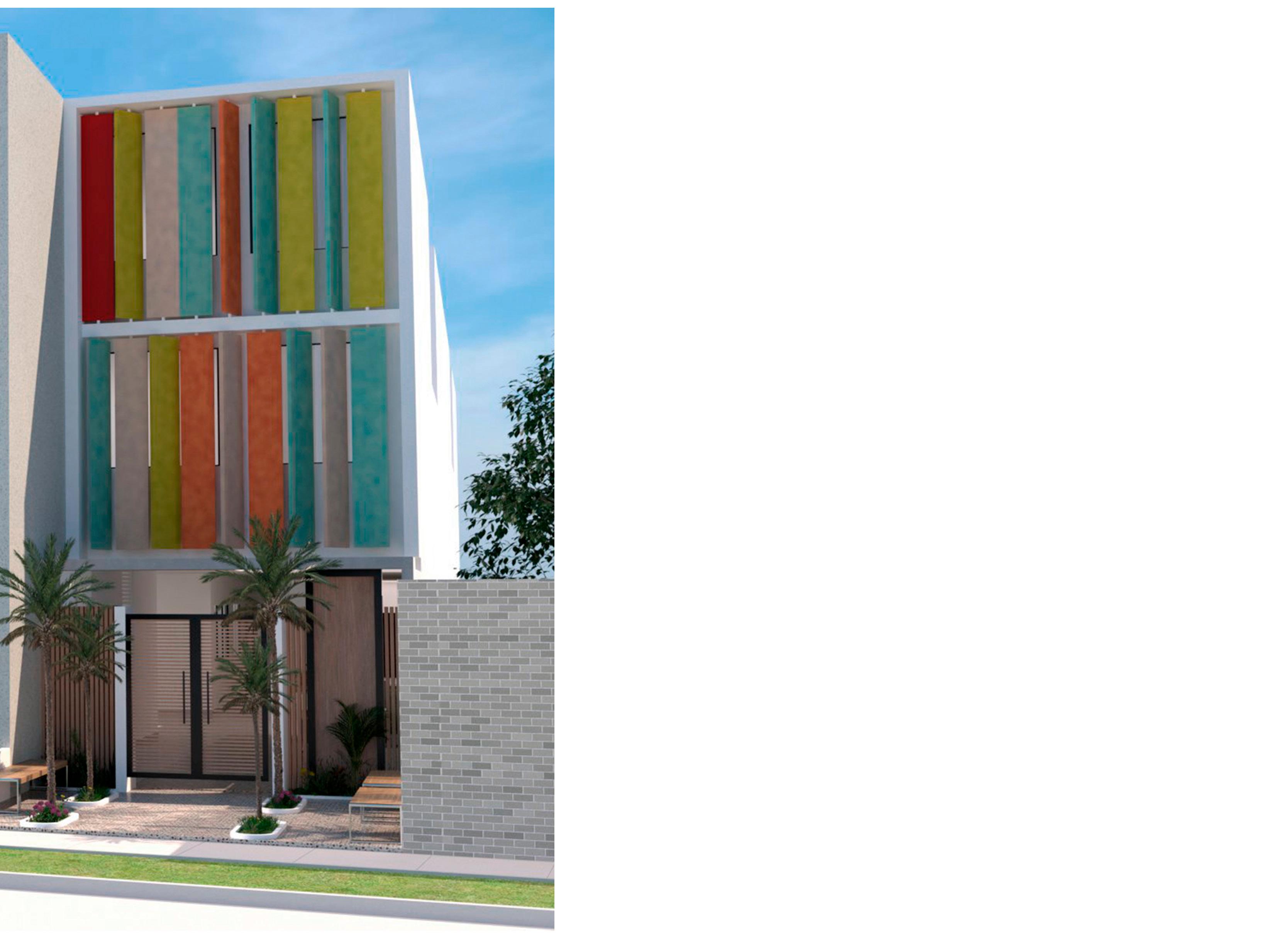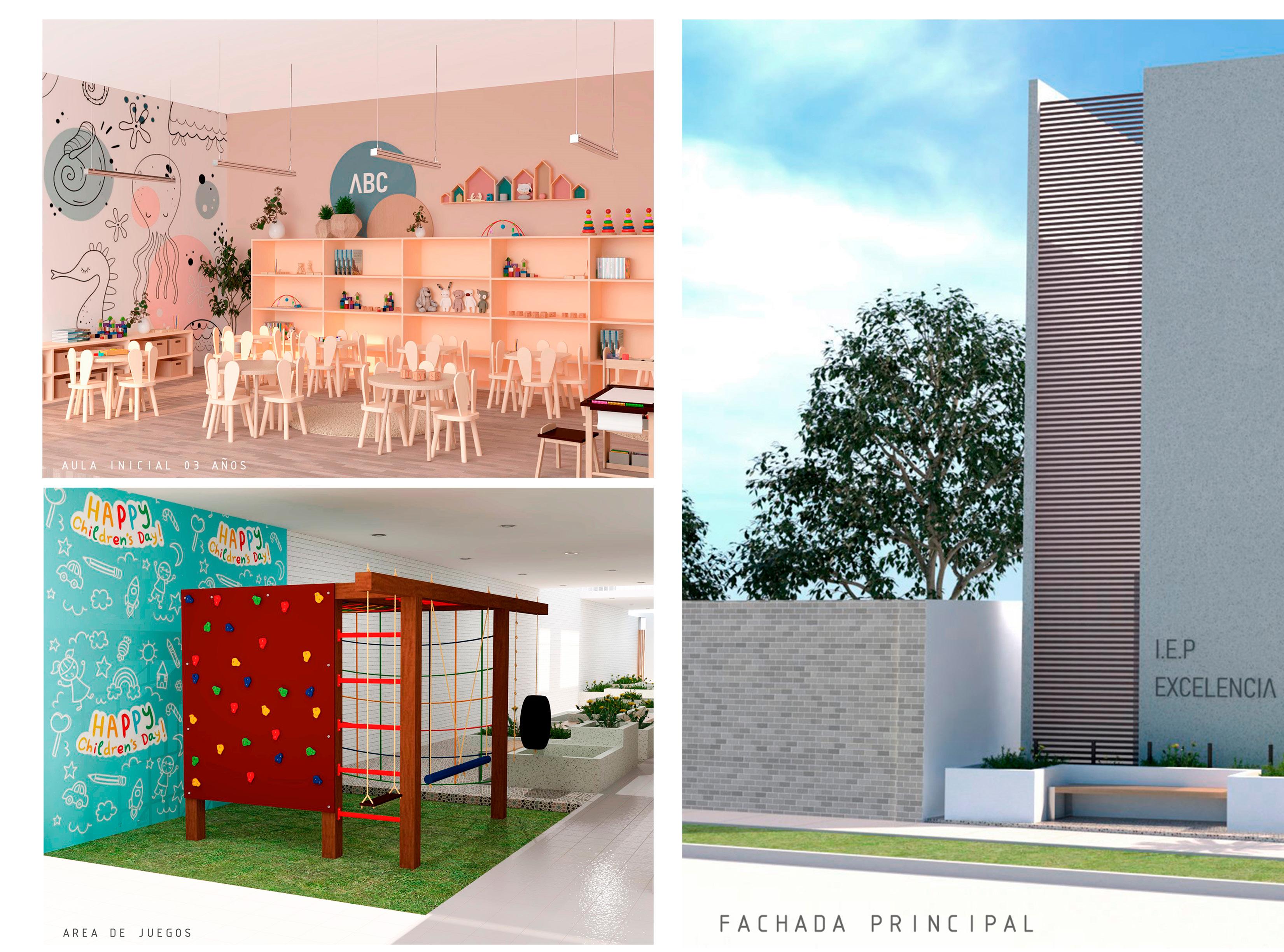 La propuesta de fachada cuenta con paneles metalicos con acabado en distintos colores para tener un lenguaje escolar, dinámico y atractivo.